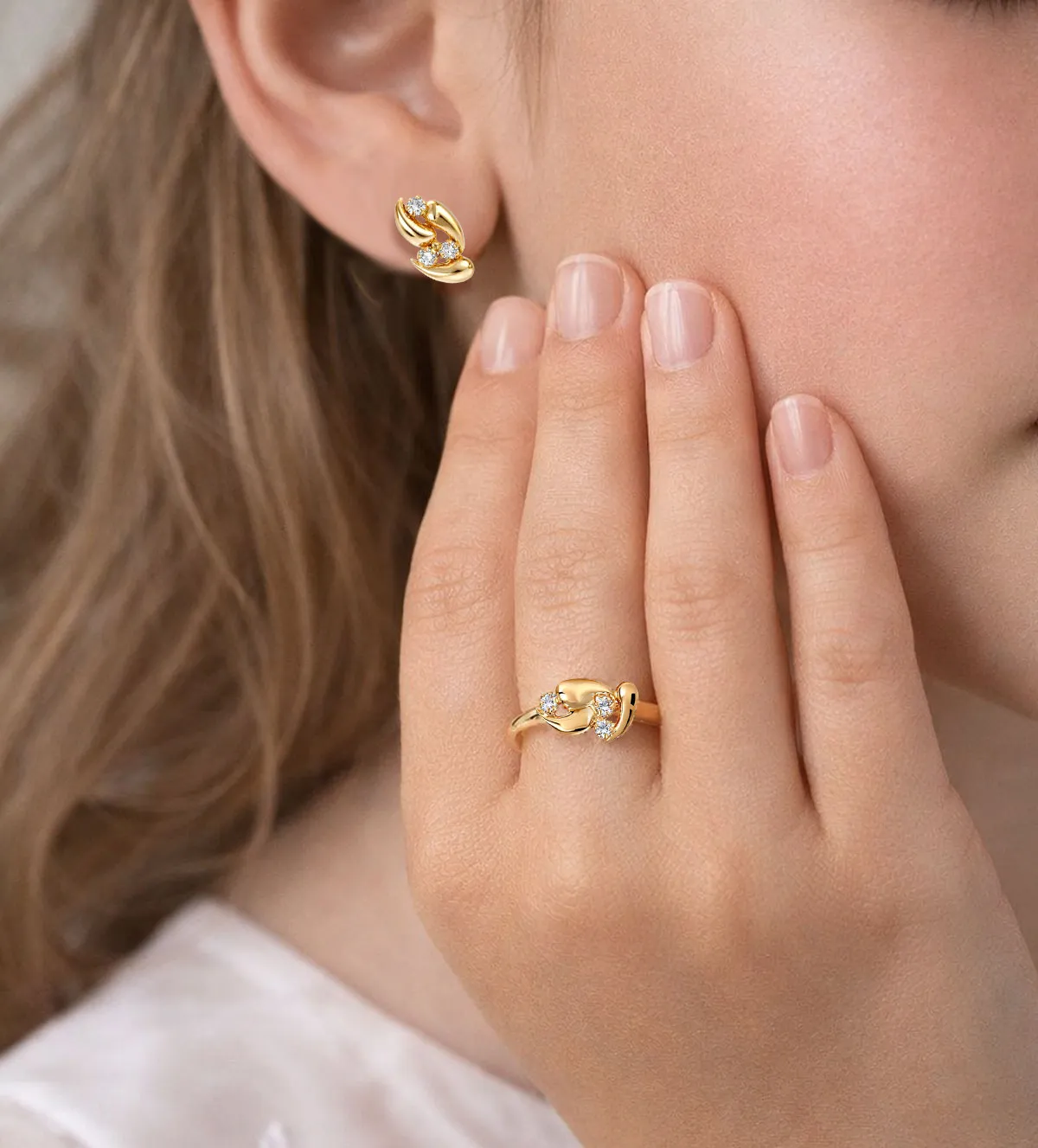 Las circonitas engastadas aportan un brillo sutil y elegante, cuidadosamente seleccionadas para complementar el diseño sin restar protagonismo al oro. El engaste en garras asegura la correcta sujeción de las piedras y permite que la luz se refleje con intensidad, realzando cada detalle de la pieza.