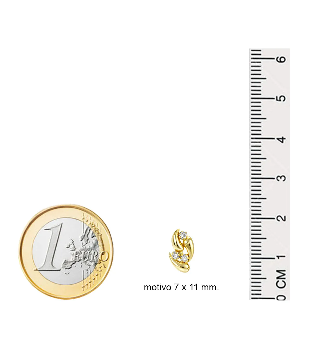 El diseño de estos pendientes de oro destaca por su armonía y delicadeza. Están formados por tres formas de lágrima estampadas, dispuestas de manera vertical y horizontal, creando una composición equilibrada y visualmente atractiva. Entre estas formas se integran tres circonitas que aportan luminosidad y un toque sofisticado.