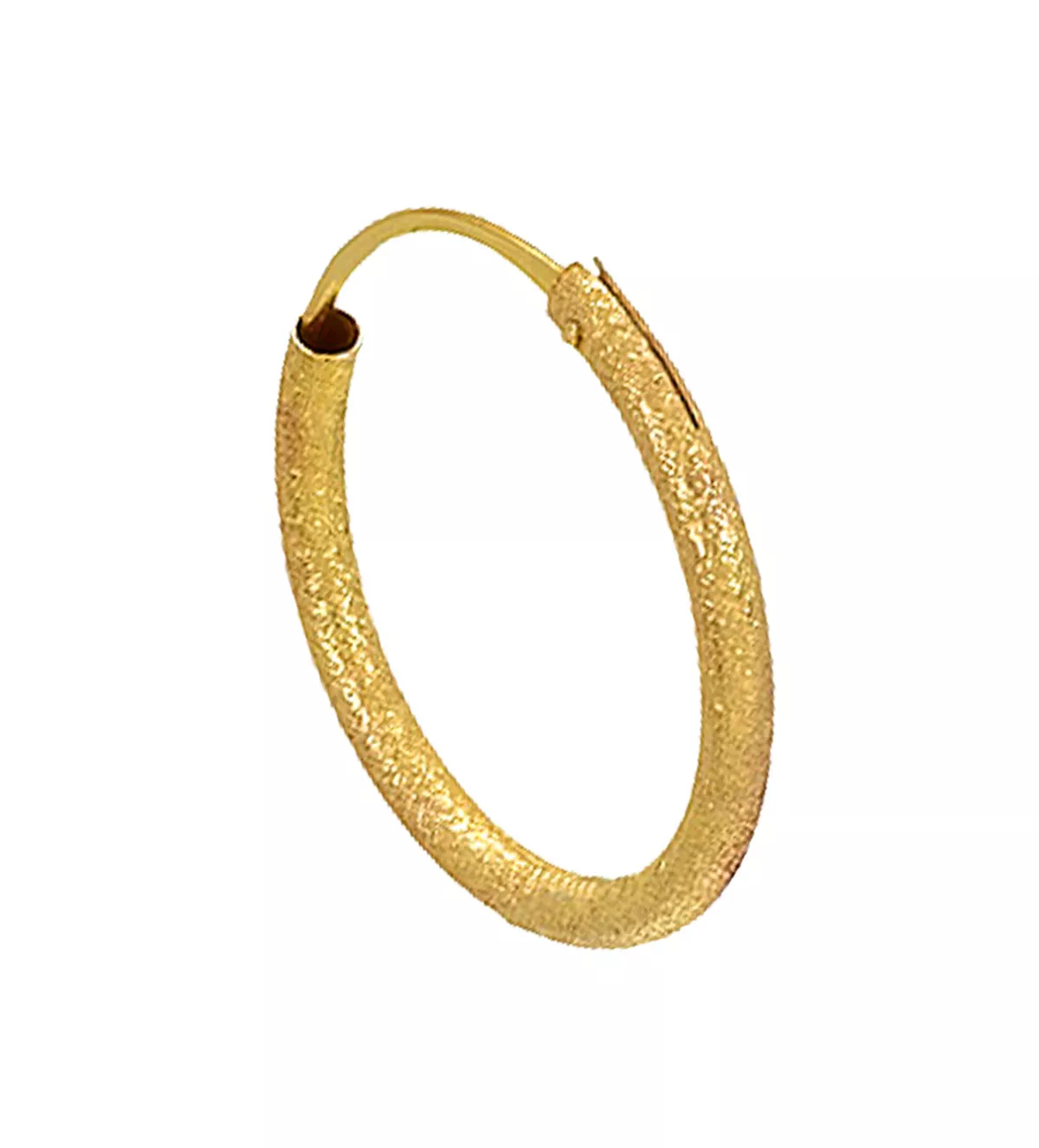 Pendientes de oro de 18k, tipo criollas: elegancia y versatilidad en un solo diseño. Con un acabado mate diamantado y un grosor de 1,30 mm, estos pendientes de aro cuentan con un cierre de hilo en punta que permite realizar el agujero en el lóbulo si es necesario, ganándose el nombre de abridores. Perfectos para quienes buscan estilo y funcionalidad en una joya atemporal.