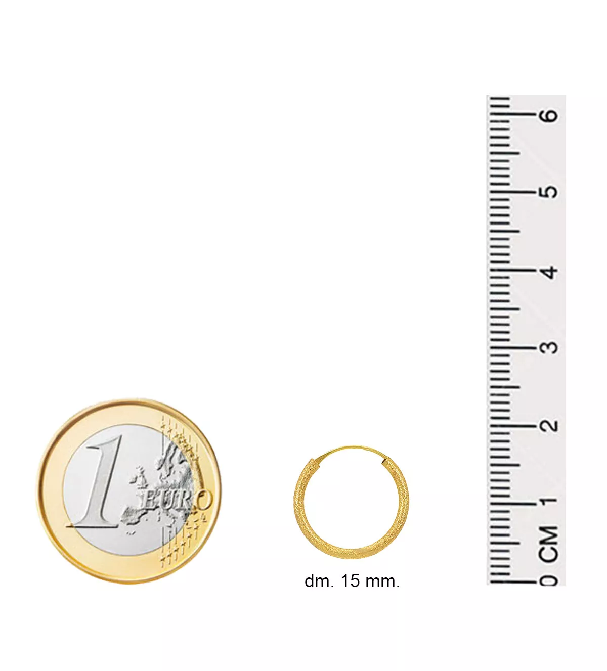 El diseño de estos pendientes de oro combina la tradición con un toque contemporáneo gracias a su acabado mate diamantado. Este tratamiento le da a la superficie de los pendientes un brillo sutil pero elegante, que capta la luz de manera discreta pero sofisticada. La forma de aro o criolla es un clásico de la joyería, y con un grosor de 1,30 mm, estos pendientes mantienen un equilibrio perfecto entre delicadeza y presencia. Su cierre de hilo en punta permite una sujeción segura, además de ofrecer la opción de ser utilizados como abridores, lo que añade una funcionalidad única.