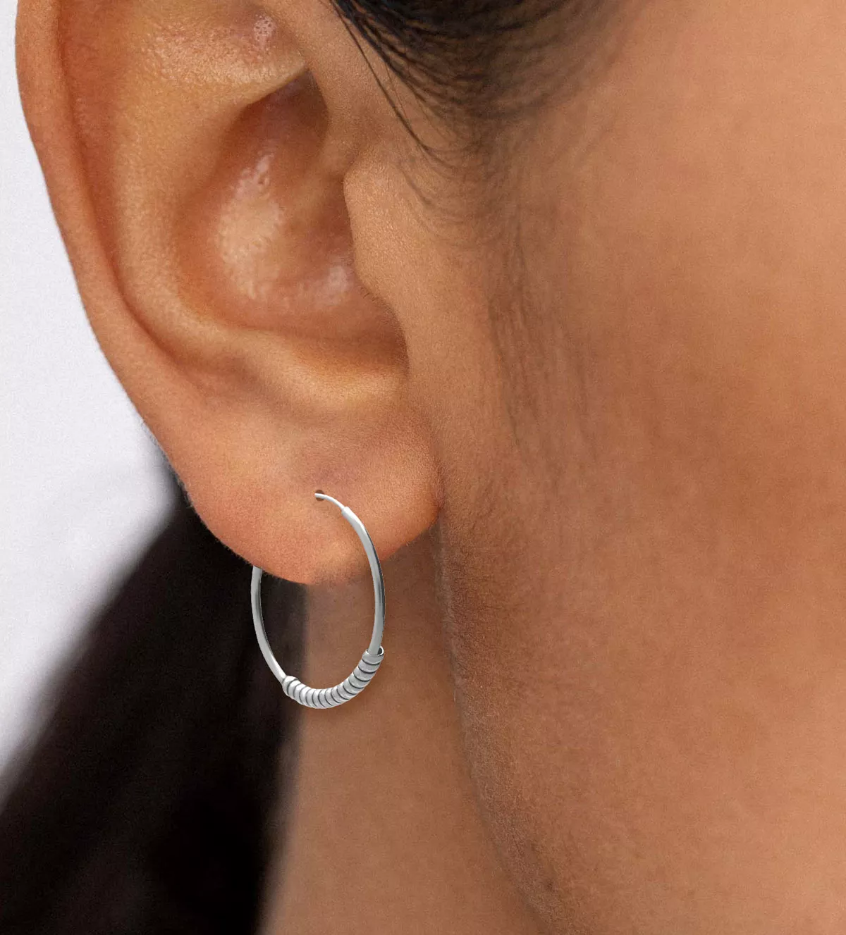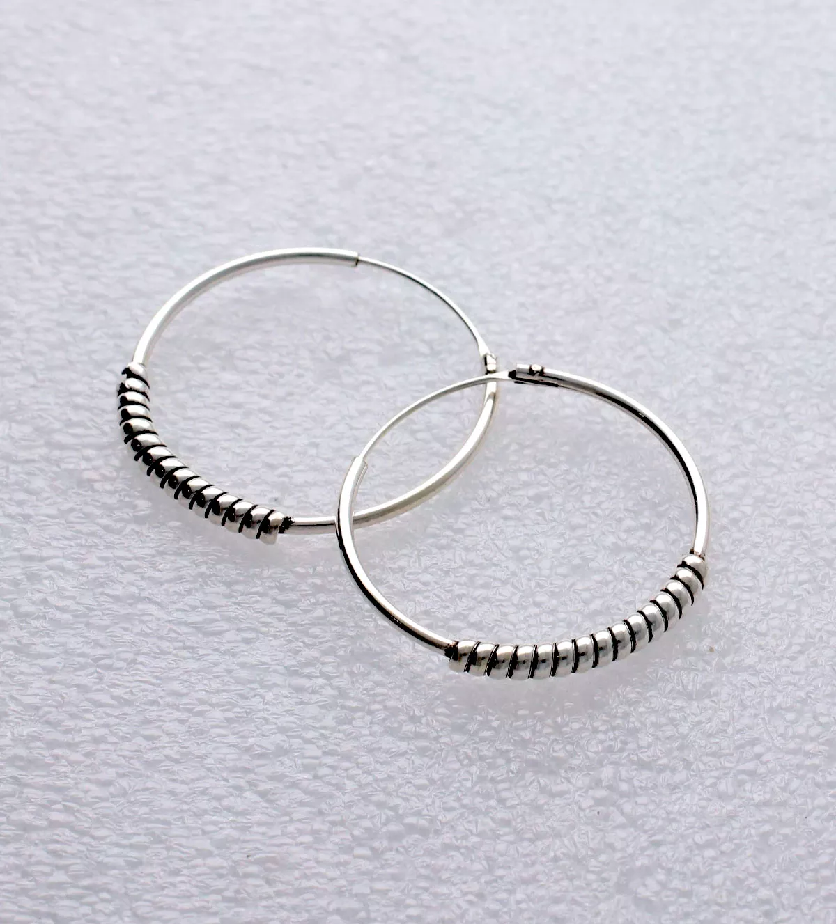 Destaca tu estilo con estos pendientes de plata de aro redondo, un accesorio tribal y único que no pasa desapercibido. Elaborados en plata vieja con un acabado de alta calidad, estos pendientes presentan una original media camisa de gallones circulares que envuelven el aro. Su cierre de púa se ajusta de manera segura, ideal para cualquier ocasión.
