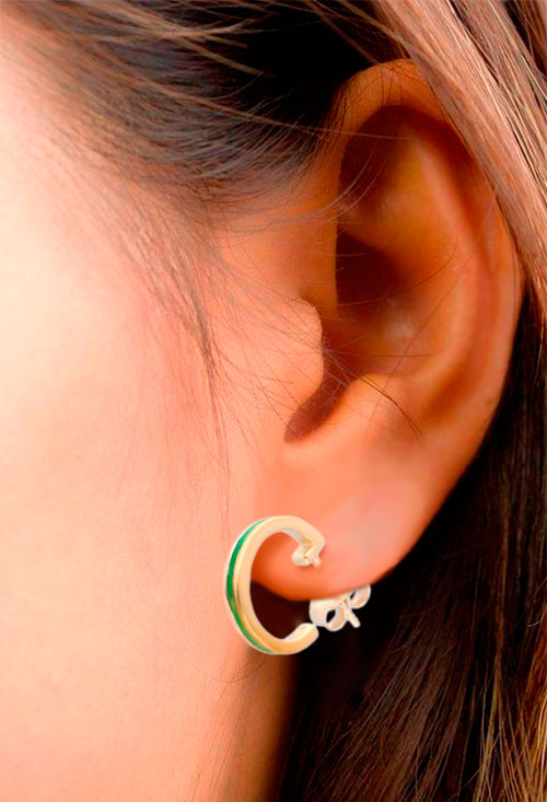 Pendientes de plata Chapada en color oro amarillo con esmalte en color verde, preciosos pendientes de aro en el que se aprecia el contraste de el color del oro con el esmalte en verde, unos pendientes que atraerán las miradas hacia el rostro de su portadora.