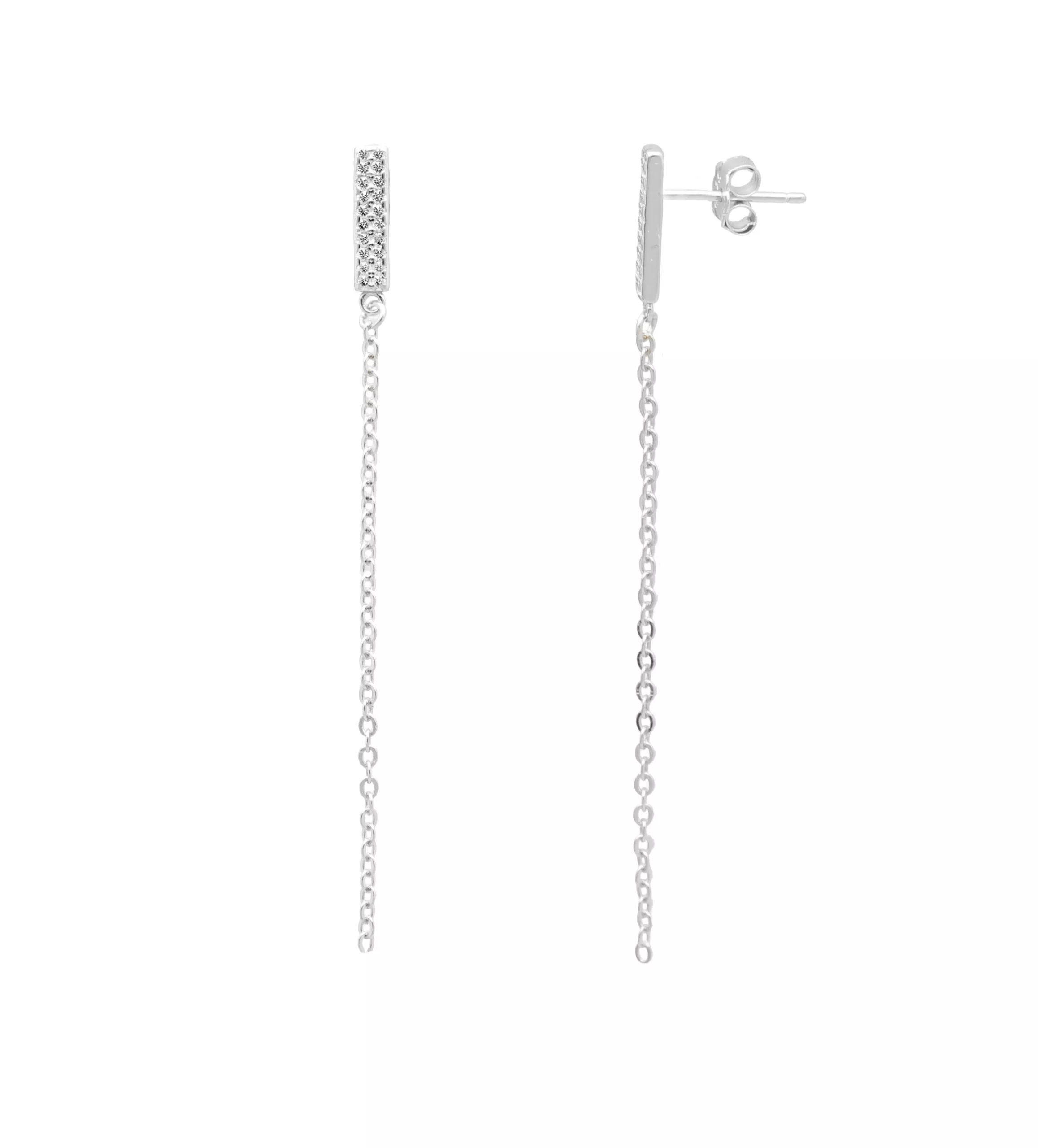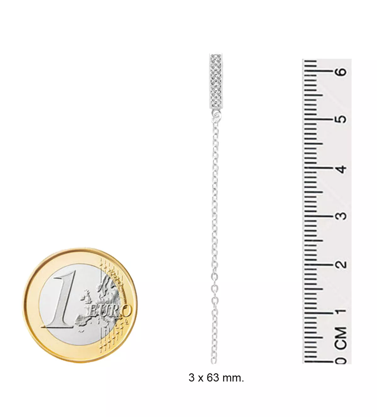 Pendientes de plata largos tipo cadena, un modelo largo con desplazamiento que hace que te sientas especial con cada movimiento de tu rostro, una cadena de eslabones forzados que cuelga de una forma rectangular cuajada de circonitas, estos pendientes se abrochan con sistemas de presión.