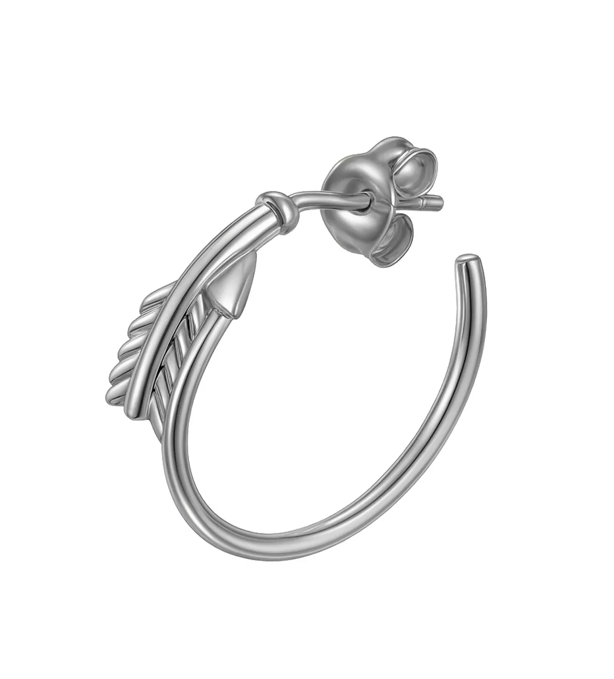 Pendientes de plata de aro en forma de flecha, elaborados en plata de ley con cierre a presión. Su diseño tribal y urbano aporta un estilo moderno y cosmopolita, perfecto para cualquier ocasión y para ambos sexos. Una joya ligera, original y muy actual que realza tu look con un toque cultural único. Disponibles de inmediato en Rubí Joyeros, la mayor joyería online de España. ¡Hazlos tuyos hoy mismo antes de que se agoten!