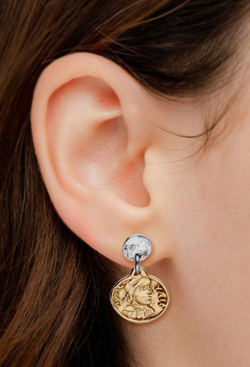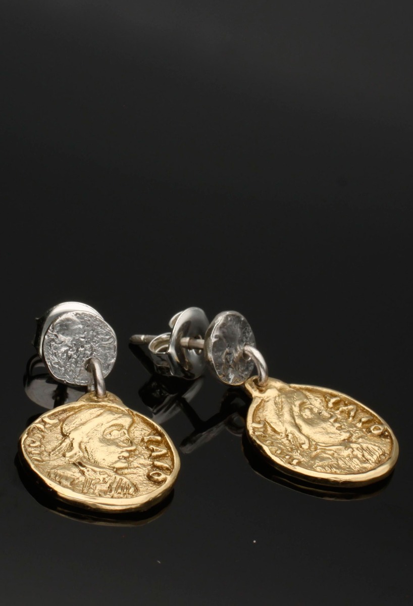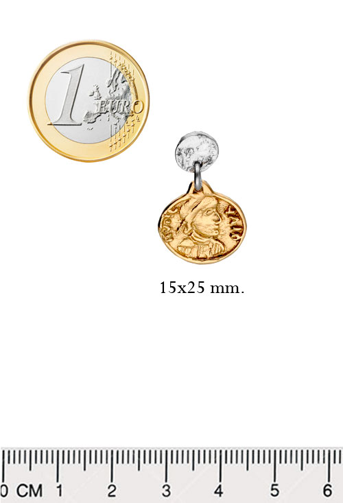 Pendientes de plata bicolor largos con moneda, original diseño de talleres Altana, marca especializada en joyería tribal que se distingue por utilizar reproduciones de monedas antiguas en muchas de sus creaciones, en este modelo una moneda de plata chapada cuelga de un motivo circular que se sujeta a la oreja mediante sistemas de presión.