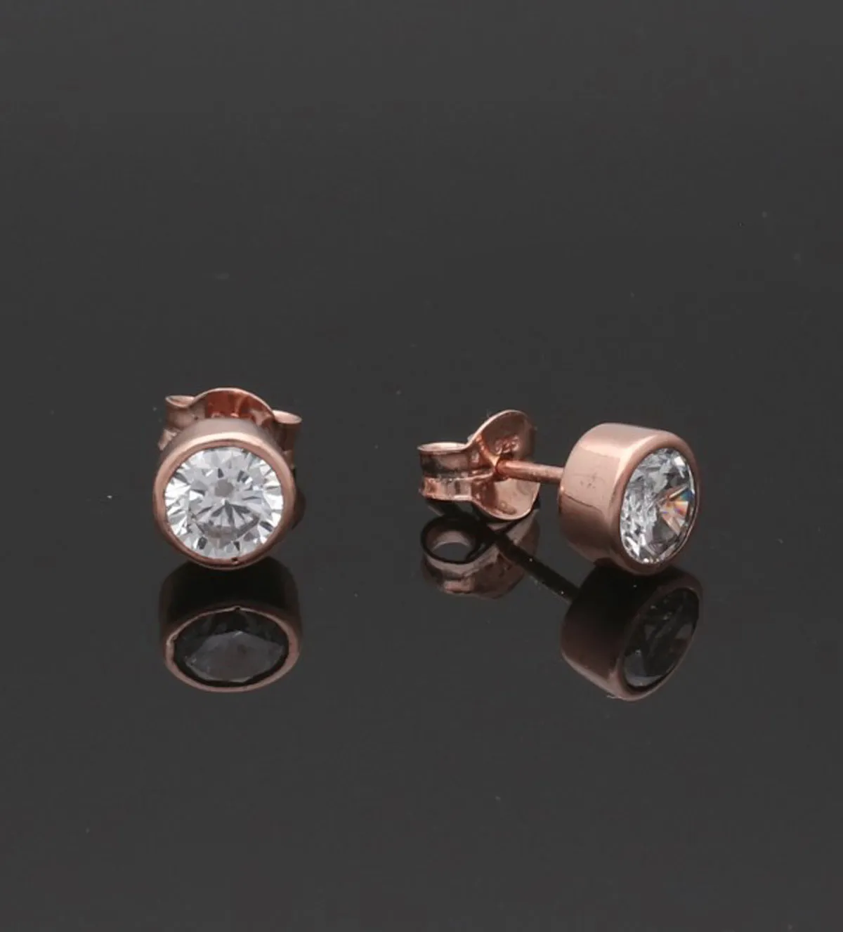 Pendientes de plata chapada en oro rosa con circonitas deslumbrantes, un diseño tipo chatón sofisticado que ilumina tu rostro con elegancia. Ligeros y cómodos, con cierre seguro de presión, son perfectos para combinar con cualquier look, desde el más casual hasta el más refinado. Una joya atemporal que une delicadeza y distinción. ¡No esperes más, las unidades son limitadas y vuelan rápido! Disponibilidad inmediata en nuestra joyería online.