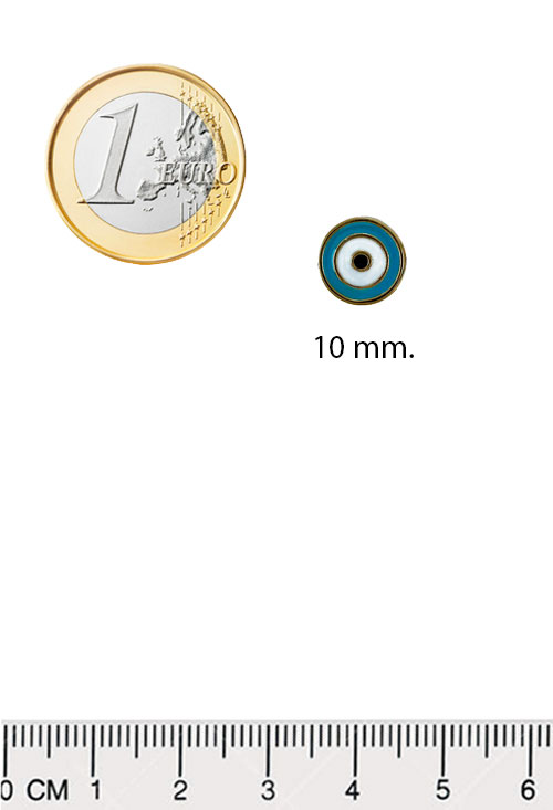 Pendientes de plata chapados en color oro amarillo con esmalte tricolor, para proteger a las personas que quieres, un precioso arete que además de favorecer a la persona que lo lleva puesto cumple con la funcion del mejor amuleto que existe para acorazar a las personas contra los malos deseos y la envidia de otras personas, estan realizados en plata de ley 925 milésimas, esmaltados en blanco azul y negro en círculos concéntricos, cierre presión en el que figura el contraste de la pureza de la plata.