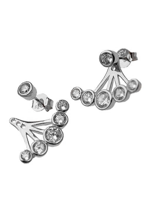 Pendientes plata de ley y circonitas, modelo desmontable 2 en 1 plata de ley con circonitas, cinco chatones en forma de abanico quedan dispuestos justo por debajo de tu lóbulo, se sujetan por la parte trasera de la oreja a  un chatón con sistema de presión, bonita joya de moderno diseño para los estilos más modernos y casuales.