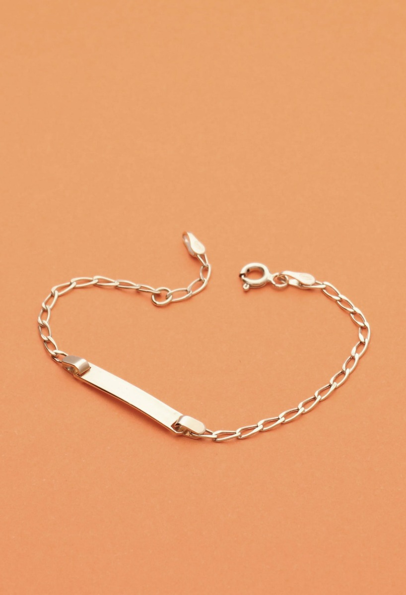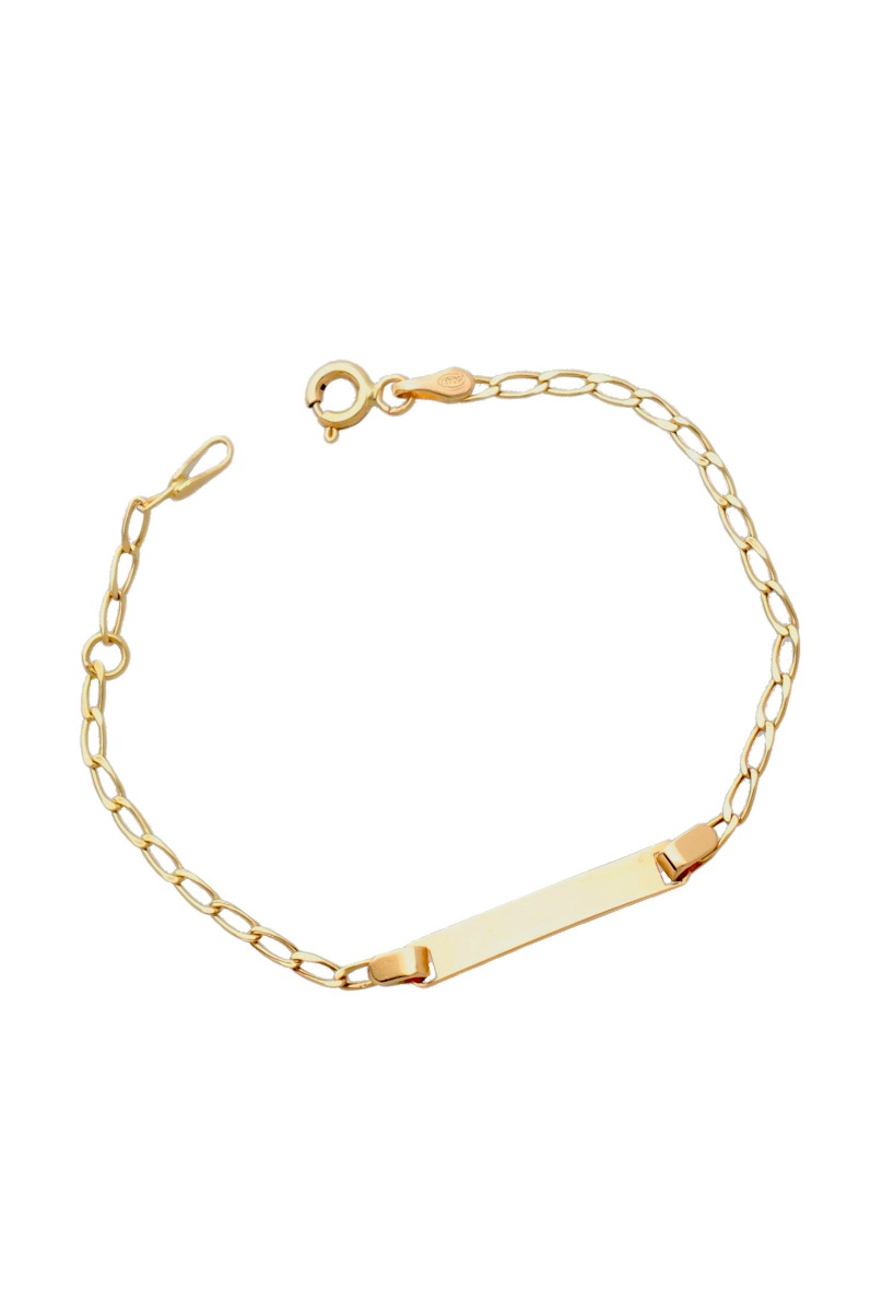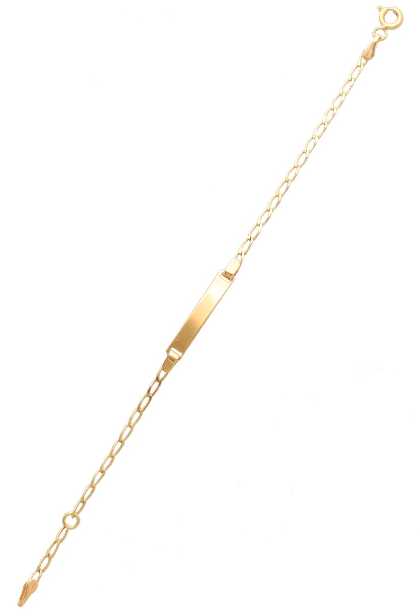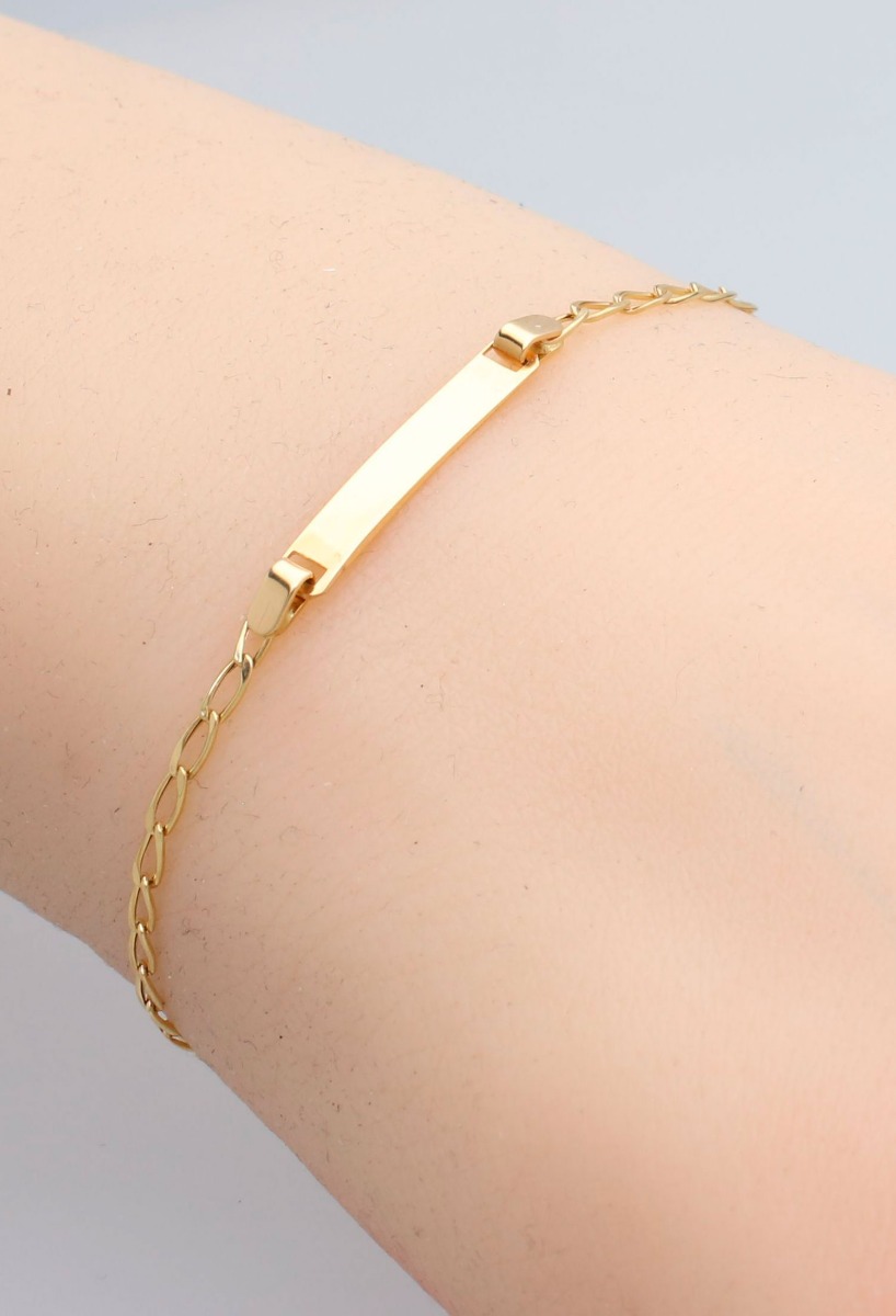 Pulsera de bebé realizada con oro amarillo 18 kilates tipo esclava (pulseras con chapa para grabar) cadena de eslabones barbados alargados con cierre de reasa, esta pulsera lleva un asa redonda a 4 eslabones de uno de los extremos para poder tener dos alternativas de largo, de esta forma la pulsera podrá utilizarla el niño o la niña durante años antes de que le quede pequeña y luego pasara a ser uno de los recuerdos más bonitos de su nacimiento o bautizo.