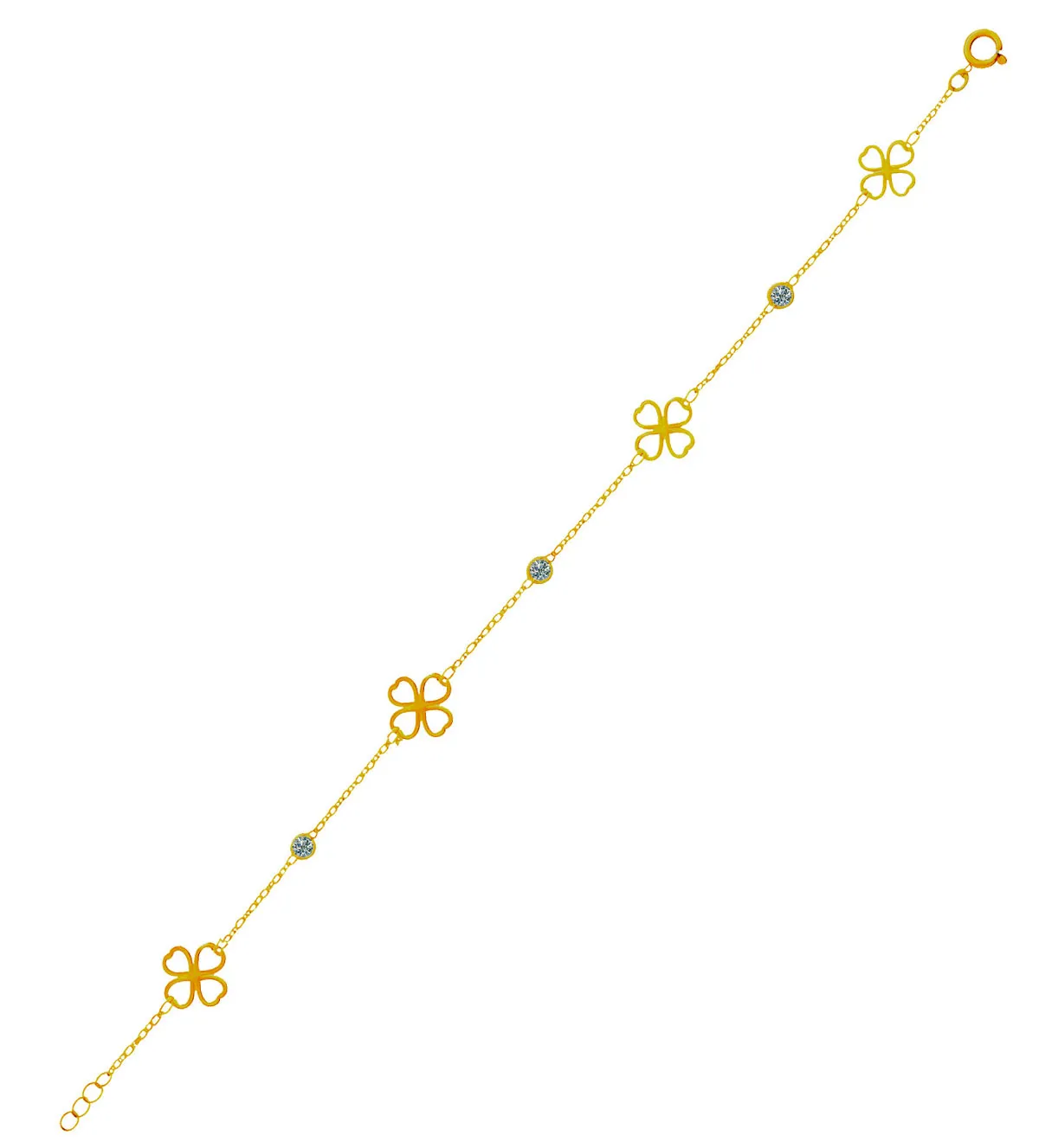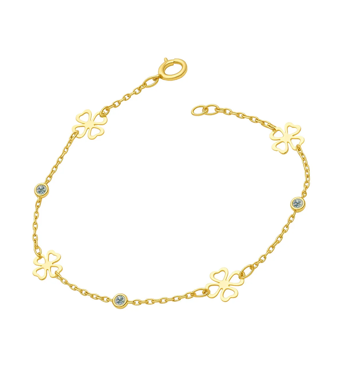 Pulsera de oro que enamora a primera vista con su delicado diseño de tréboles y circonitas brillantes. Elaborada en oro amarillo de 18 quilates, su cadena forzada aporta un estilo elegante y fresco, ideal para niñas y mujeres. Su longitud adaptable permite lucirla con total comodidad en cualquier ocasión. Añade un toque único de luz y buen gusto a tu joyero. ¡No esperes más para hacerla tuya! Stock limitado y disponibilidad inmediata.