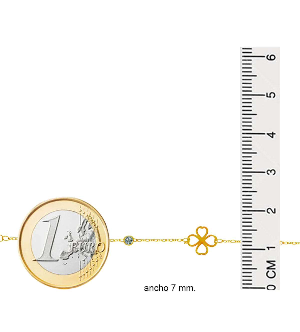 La pulsera tiene un largo adaptable de 17 a 18 cm, lo que permite ajustar fácilmente la medida a la muñeca de cada persona, desde niñas hasta mujeres adultas. El cierre tipo reasa facilita su colocación con comodidad y seguridad. El trébol central mide 7 mm de ancho, un tamaño discreto que aporta un detalle encantador sin recargar el diseño. Su ligereza, con un peso aproximado de 1,30 gramos, permite llevarla a diario sin sentir molestias.