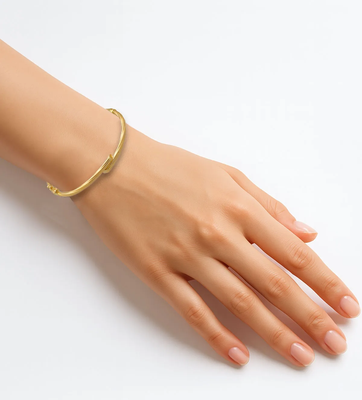 Confeccionada en oro amarillo de 18 quilates, esta pulsera tipo aro rígido es mucho más que un complemento. Su presencia llama la atención por su estilo cruzado en forma de trenza, un detalle ornamental que combina tradición y modernidad.