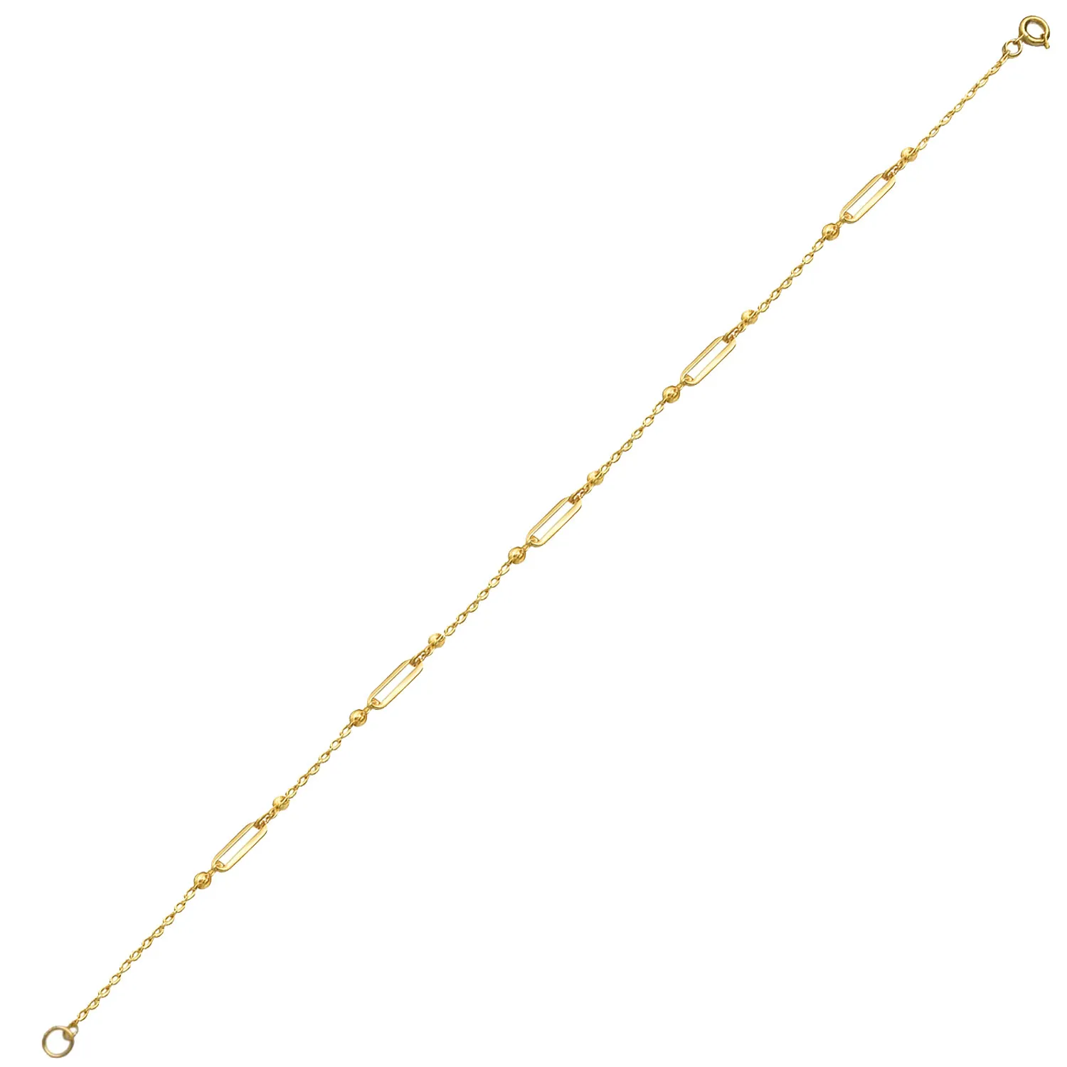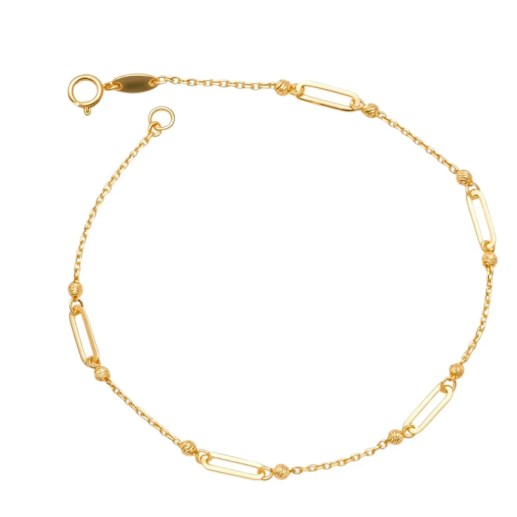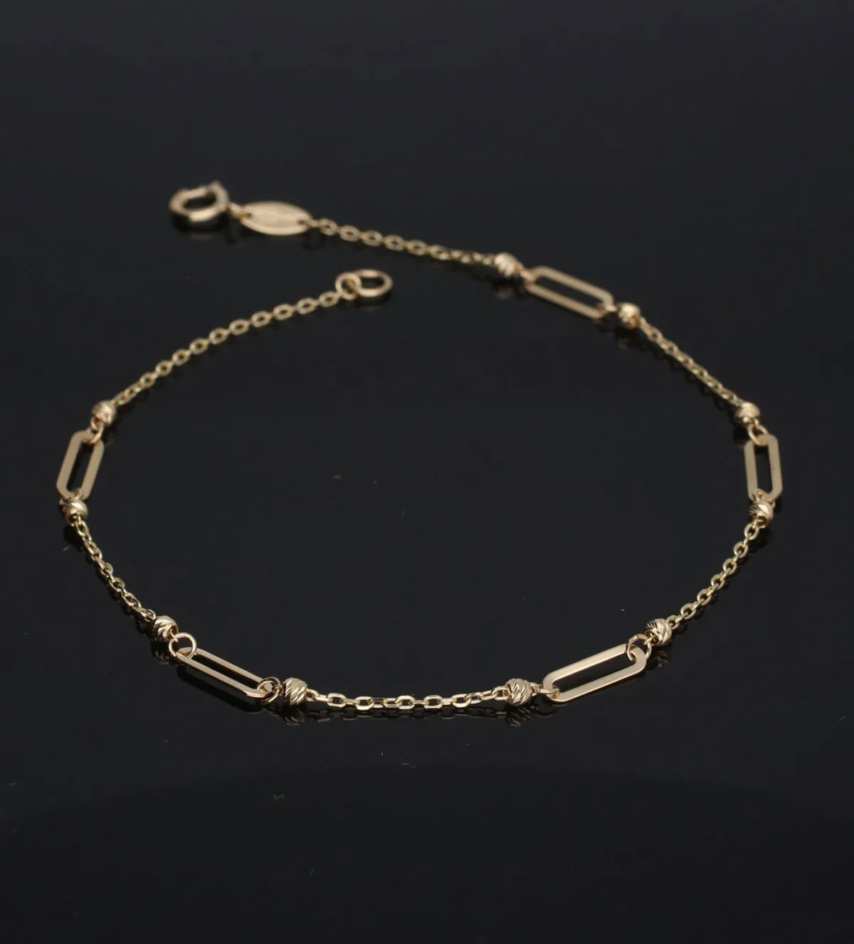 Pulsera de oro con diseño elegante y versátil, elaborada en oro amarillo de 18 ktes con acabado brillo. Sus entrepiezas ovaladas entre bolas facetadas aportan un toque sofisticado que realza cualquier look. Ideal para uso diario o para ocasiones especiales, ofrece un equilibrio perfecto entre delicadeza y estilo. Disponible con cierre de seguridad y lista para envío inmediato. ¡Adquiérela ahora y no pierdas la oportunidad, stock limitado!