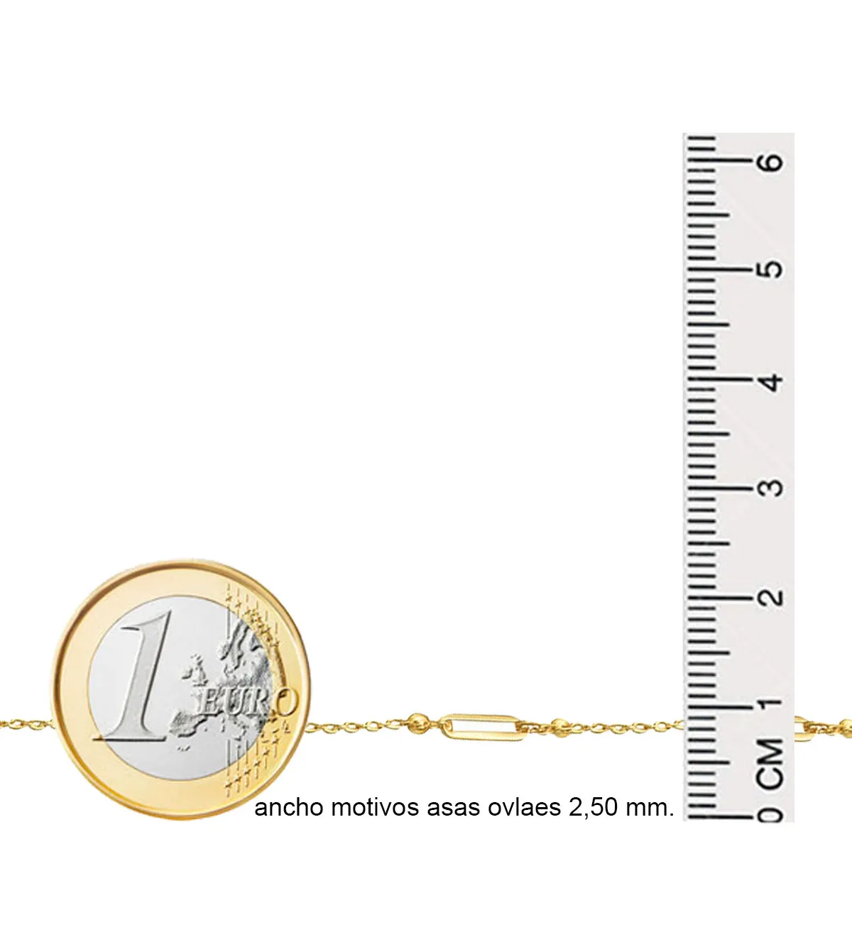 El diseño de esta pulsera de oro combina cinco entrepiezas en forma de asa oval plana, intercaladas con bolas lapidadas que aportan un efecto de luz y textura. Esta estructura logra un equilibrio perfecto entre delicadeza y personalidad, destacando tanto en un look de diario como en un conjunto de noche.