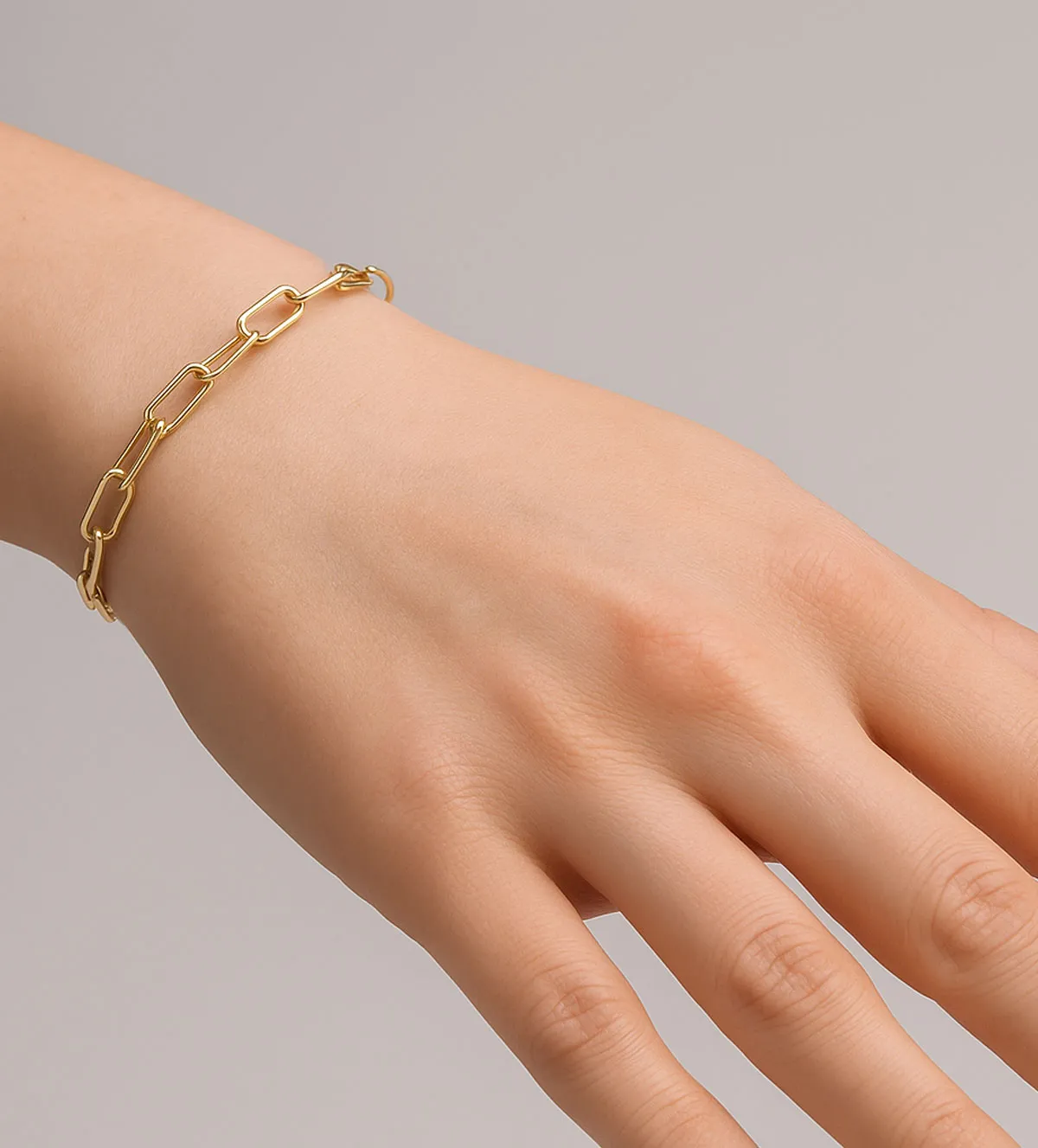 La pieza presenta una cadena de asas ovaladas con acabado en brillo, un detalle que realza su atractivo visual. Su diseño limpio y elegante permite que combine fácilmente con otros complementos, ya sean collares, anillos o relojes. Este estilo clásico pero moderno la convierte en una pulsera atemporal, perfecta para quienes buscan una joya versátil.