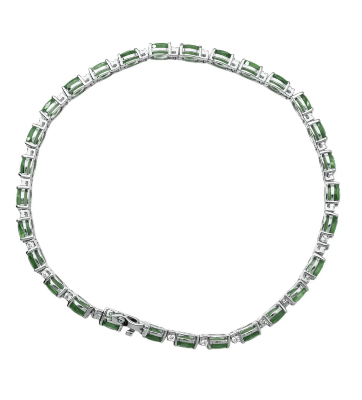 El diseño tipo tenis de esta pulsera presenta esmeraldas talla oval engastadas entre pequeños diamantes. Las esmeraldas, conocidas por su intenso color verde, están cuidadosamente engastadas entre garritas que aseguran cada gema en su lugar. Los diamantes, engastados en pavé, rodean las esmeraldas, añadiendo un brillo espectacular que realza el conjunto. Este engaste no solo asegura las piedras de manera firme, sino que también maximiza su exposición a la luz, aumentando su resplandor.