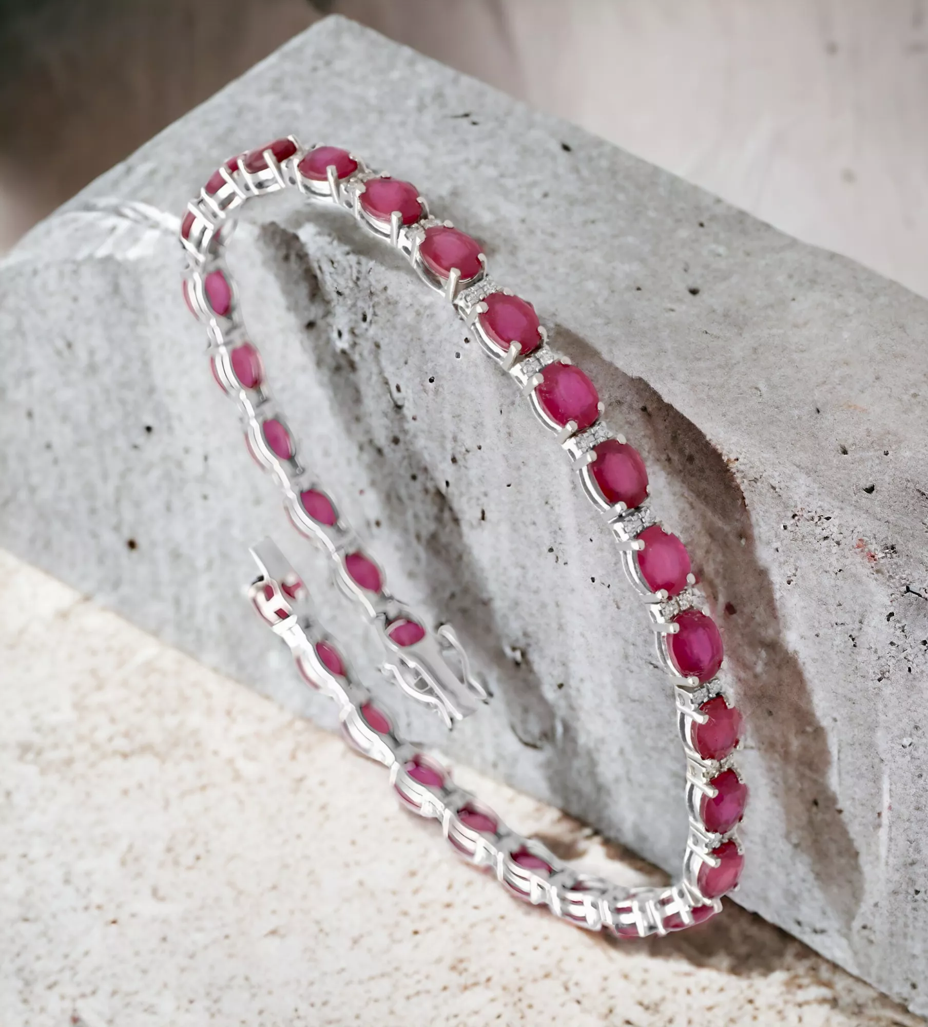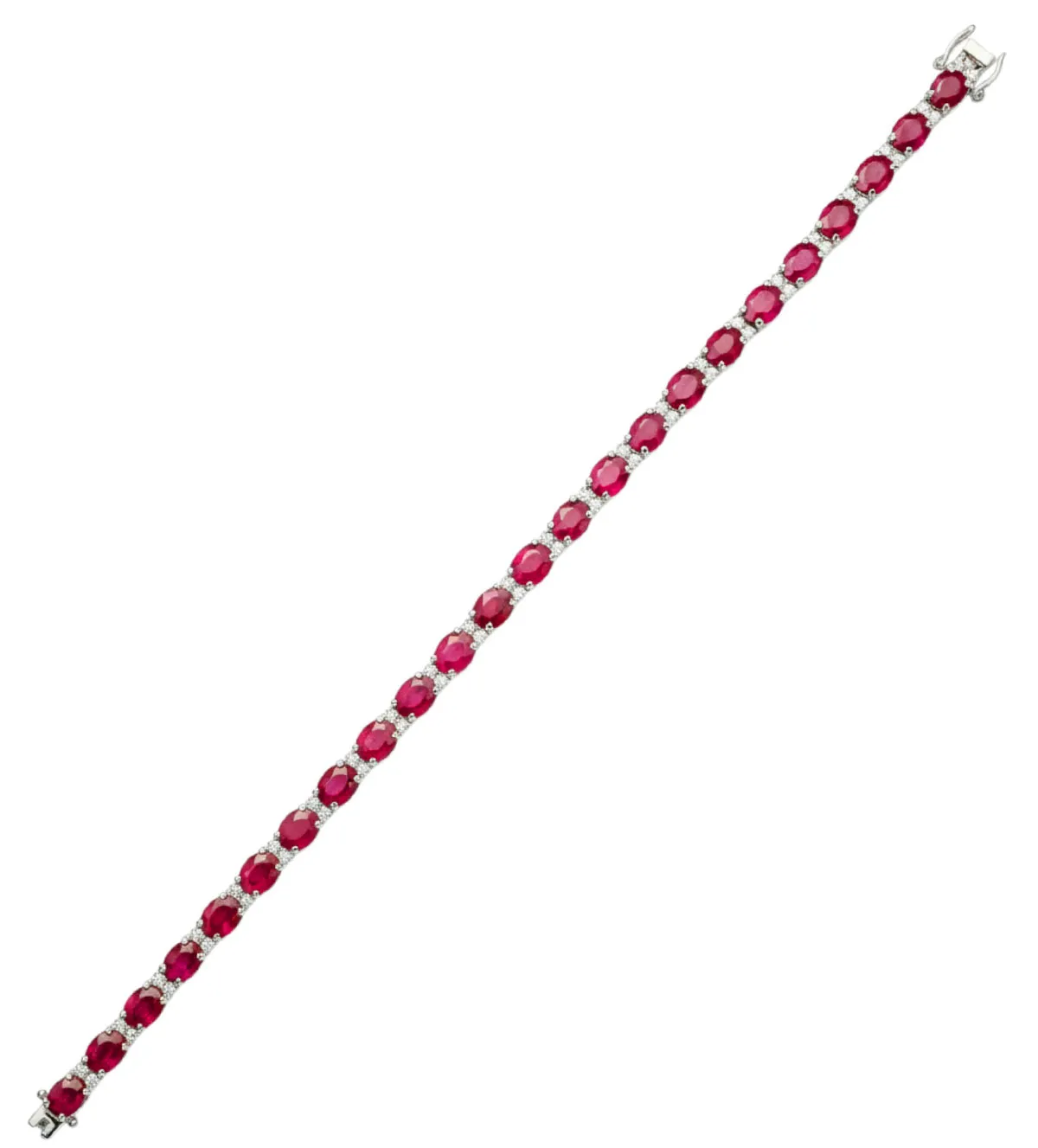 Los rubíes, tallados en forma oval, son las piedras centrales de esta pulsera. Reconocidos por su intenso color rojo, los rubíes simbolizan el amor, la pasión y la energía. La talla oval de los rubíes permite una máxima reflexión de la luz, creando un brillo espectacular. Estos rubíes están meticulosamente engastados entre garritas de pequeños diamantes, lo que añade un contraste hermoso y resalta el brillo de cada piedra.