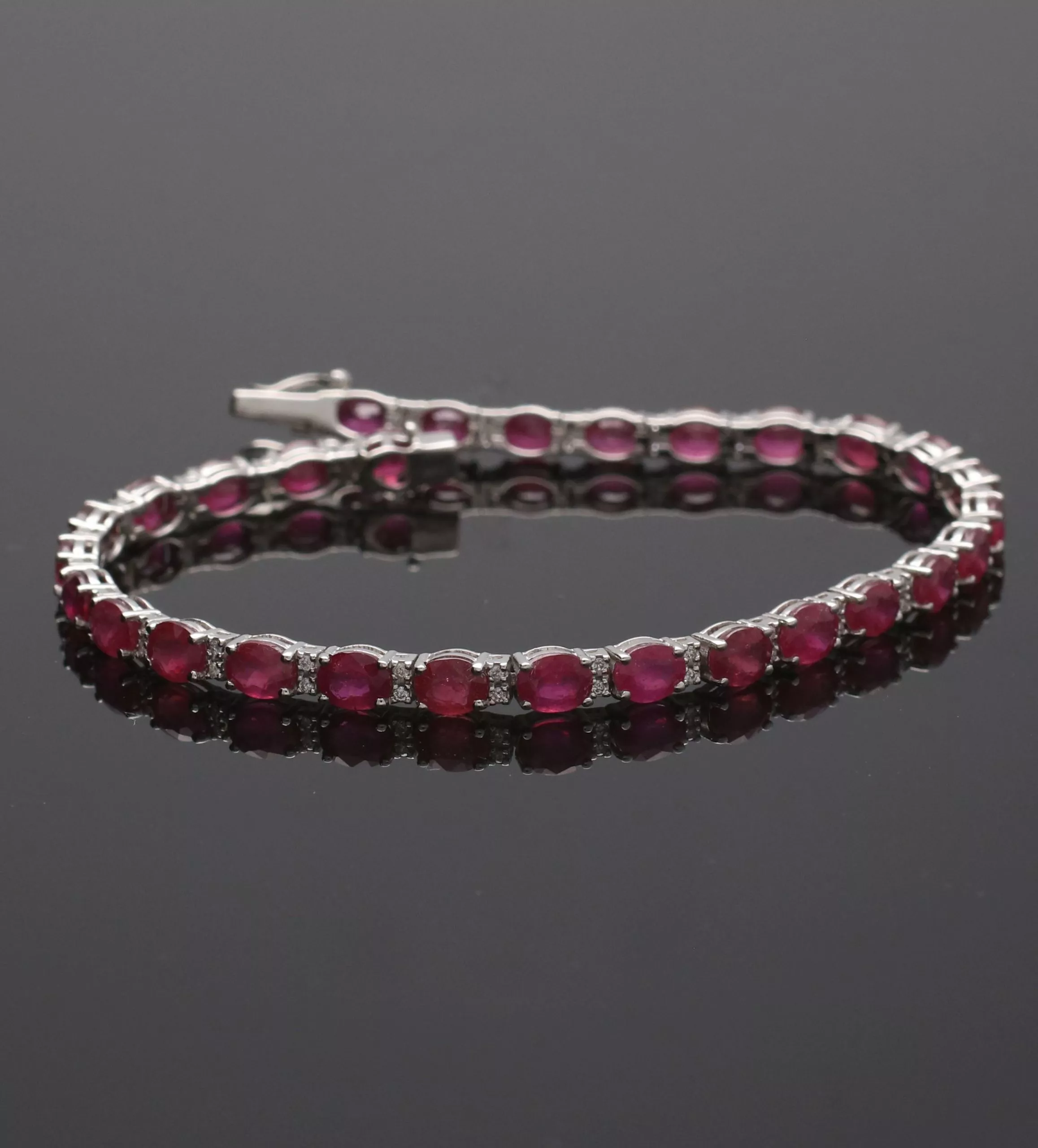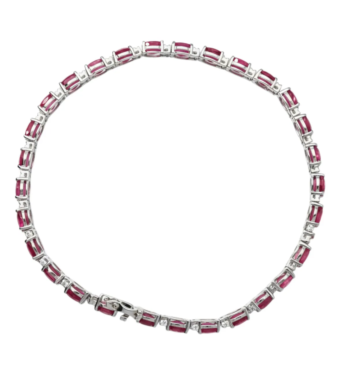 Descubre la pulsera de oro blanco 18k con rubíes y diamantes, un sofisticado modelo tenis con rubíes talla oval engastados entre garritas de pequeños diamantes. El cierre de seguridad de lengüeta y dos cerrojillos asegura un ajuste perfecto. Aprovecha nuestro descuento especial para venta online y adquiere esta joya al mejor precio.