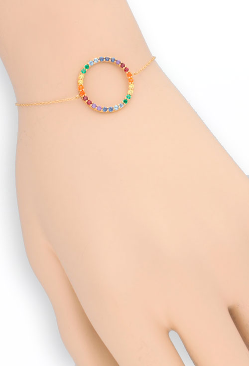 Pulsera de oro motivo circular formado por piedras multicolores, y que se cierra con cierre de mosquetón. Una pulsera de oro que nunca pasa de moda, siempre actual combina con todo tipo de complementos y se convierte en un regalo perfecto para celebrar cumpleaños y ocasiones especiales.