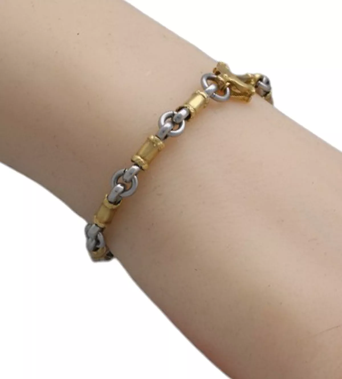 Deslumbra con esta pulsera de oro, una joya que combina oro amarillo de 18K con acero quirúrgico de alta calidad. Su diseño exclusivo, con eslabones únicos y un cierre en forma de ancla, aporta un aire náutico sofisticado, ideal para destacar en cualquier ocasión. Con 19 cm de largo, es el regalo perfecto para sorprender y recordar momentos especiales. En stock y con entrega inmediata, esta pieza única está lista para ser tuya. ¡No la dejes escapar, compra ahora y marca la diferencia!