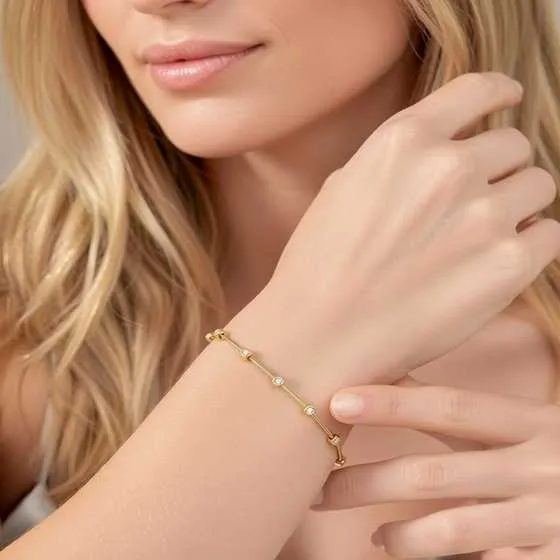 Para conservar su brillo original, se recomienda guardar la pulsera por separado y limpiarla suavemente con un paño específico para joyería. Evitar el contacto directo con productos químicos ayudará a mantener intactos tanto el oro como los diamantes. Con unos cuidados básicos, esta joya conservará su belleza durante años, acompañándote en innumerables momentos especiales.