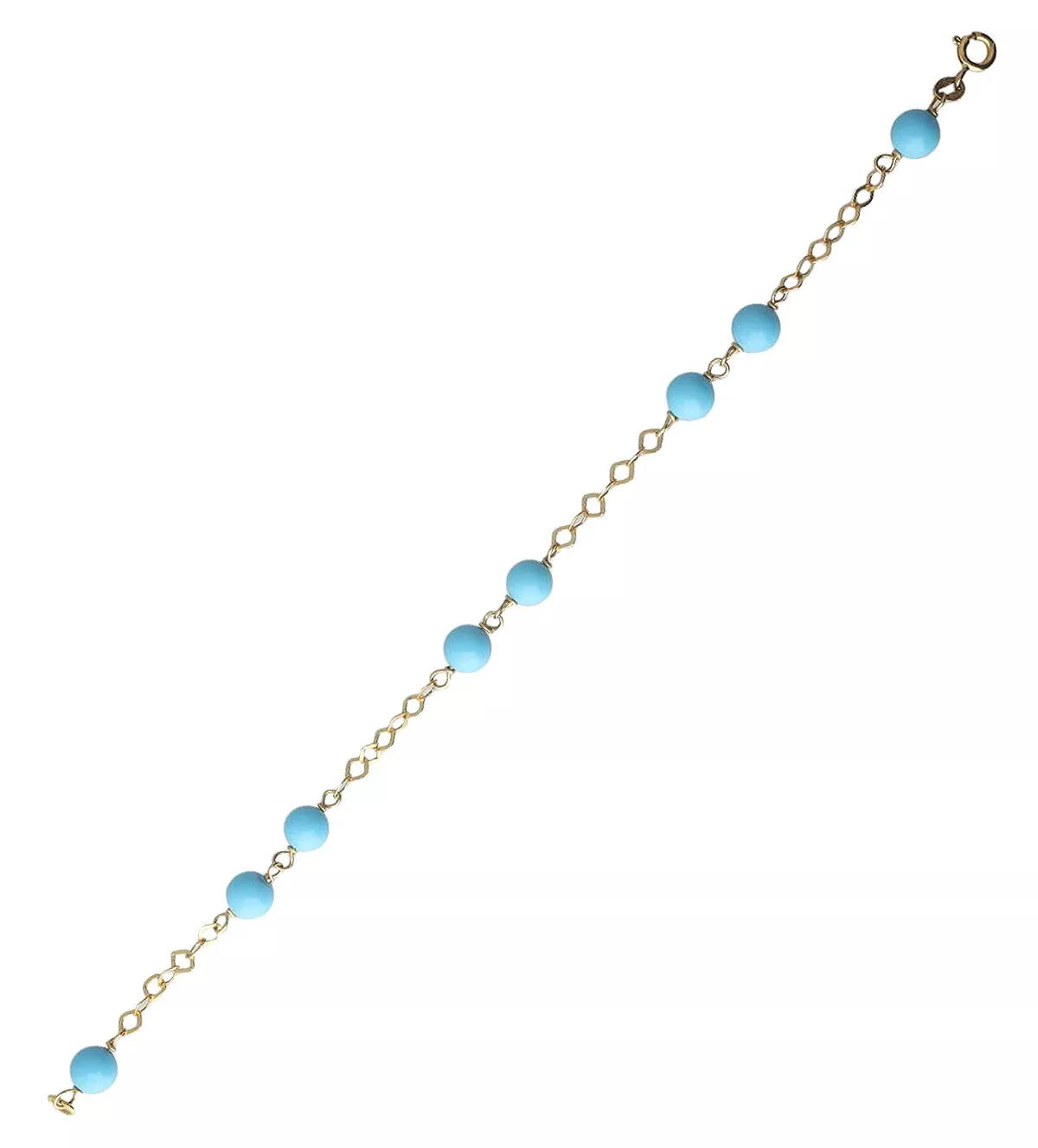 Pulsera de oro 18k con bolas de turquesa, una joya única que combina el lujo del oro amarillo con la frescura de las turquesas de 6 mm. Su diseño moderno de cadena de asas romboides es ideal para mujeres que buscan añadir color y estilo a su outfit. Perfecta para cualquier ocasión, es un accesorio imprescindible en tu colección. Producto en stock con entrega inmediata. ¡No pierdas la oportunidad de lucirla!