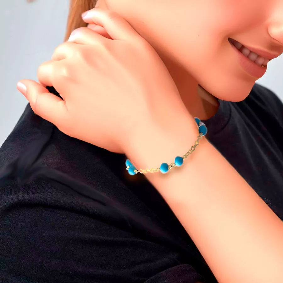 El oro amarillo simboliza riqueza y estabilidad, mientras que la turquesa es conocida por ser una piedra que atrae energía positiva y protege contra las malas vibraciones. Juntas, estas cualidades hacen que esta pulsera no solo sea una joya, sino también un amuleto lleno de significado.