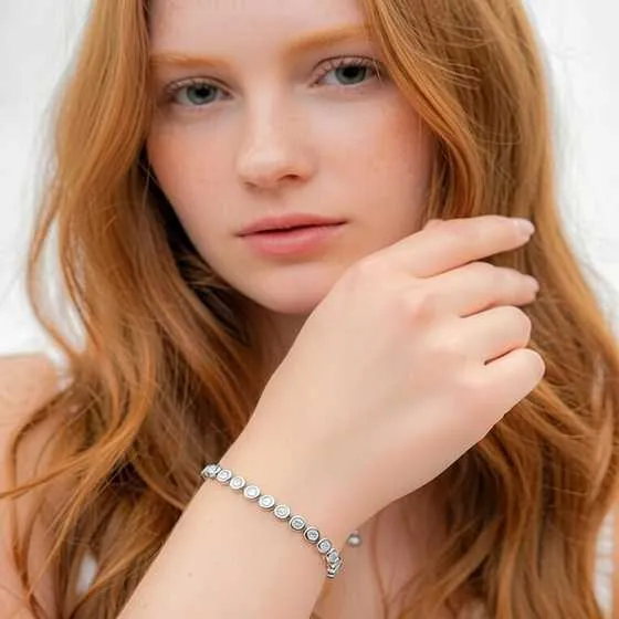 El diseño riviere es uno de los más icónicos y deseados dentro de la joyería con diamantes. Esta pulsera está formada por una sucesión continua de chatones circulares que rodean completamente la muñeca, sin principio ni final, simbolizando la eternidad. Cada chatón alberga un diamante talla brillante engastado en el centro, logrando un efecto visual envolvente y absolutamente deslumbrante.