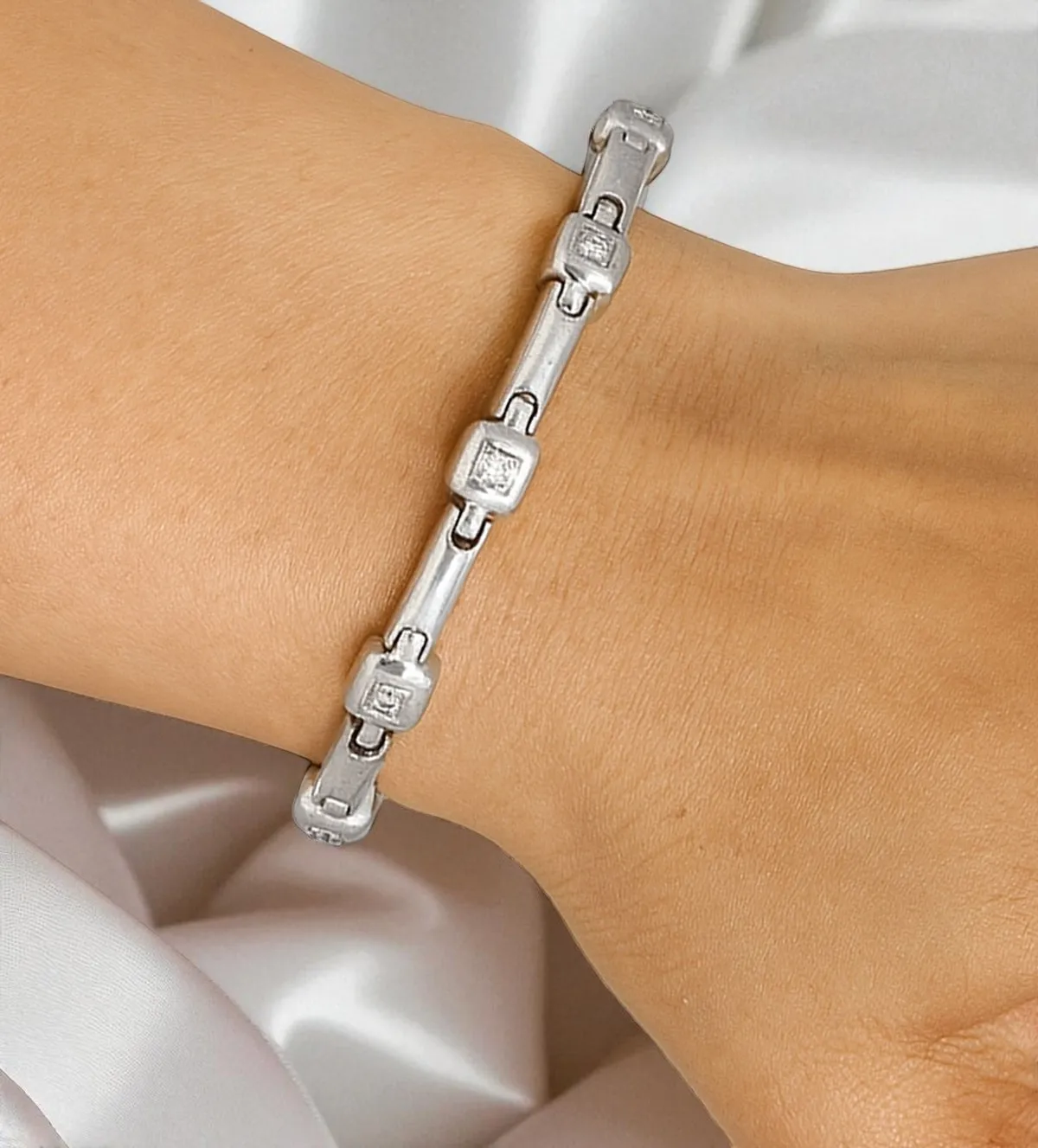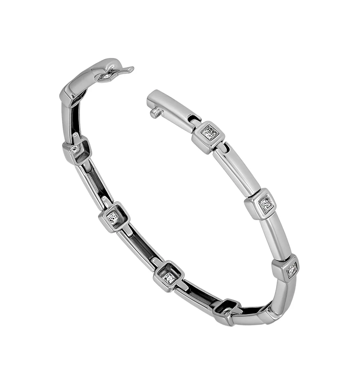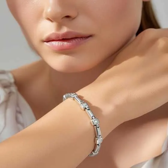 El diseño Perelli destaca por su minimalismo refinado. La pulsera alterna tramos cortos de eslabones con chatones cuadrados de 6 mm, creando un ritmo visual armonioso y moderno.