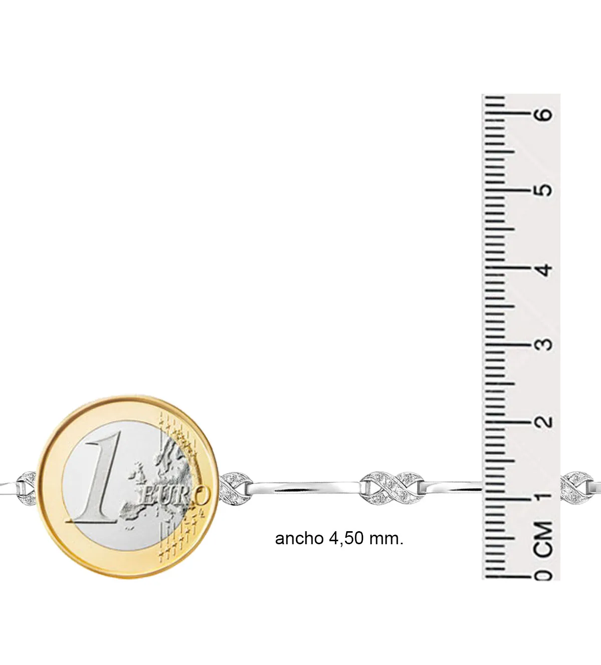 Su diseño destaca por la sucesión de entrepiezas con forma de infinito, símbolo de eternidad y continuidad. Cada sección se une de manera armoniosa, creando un estilo delicado y sofisticado que combina modernidad y tradición. Es una pulsera pensada para mujeres que buscan una joya exclusiva que nunca pase de moda.