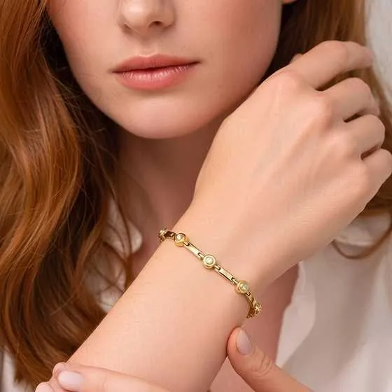 La base de esta pulsera de oro está fabricada en oro amarillo de 18 kilates, un metal precioso apreciado por su durabilidad, resistencia y calidez tonal. El oro amarillo aporta un brillo natural que realza la piel y potencia la presencia de la joya, convirtiéndola en una pieza atemporal que no pasa de moda.