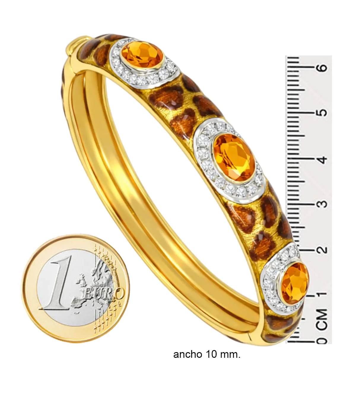 Esta pulsera está elaborada en oro amarillo 18k, un metal noble que garantiza resistencia y durabilidad. Los protagonistas son tres citrinos seleccionados entre los más bellos disponibles, de aproximadamente 2 quilates cada uno. A su alrededor, 48 diamantes talla brillante de color H y pureza VS suman 0.40 quilates, aportando destellos de luz incomparables. El esmalte a fuego, trabajado con técnicas artesanales tradicionales, asegura un acabado refinado y exclusivo.