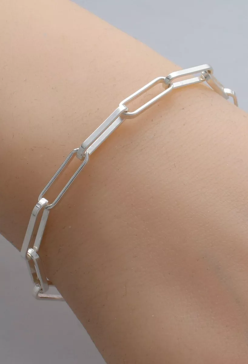 Imagina la sensación de llevar esta pulsera que destaca entre la multitud, atrayendo miradas admirativas. Los eslabones forzados alargados le confieren un atractivo único, mientras que su diseño refinado se presta a la combinación con otras joyas o para ser llevado solo como protagonista.