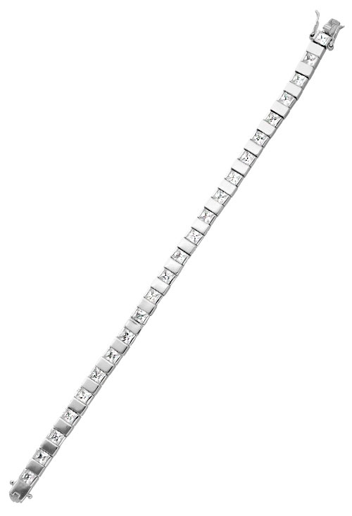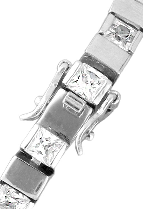 Pulsera de plata y circonitas para hombre, exclusivo modelo de pulsera realizada alternando eslabones cúbicos lisos con circonitas talla cuadrada a modo de uno por uno, dispone de un cierre de lengüeta en cajetin y dos cerrojillos de ocho laterales, ideal para hombre o también para mujer de muñeca grande, pulsera muy elegante que nunca pasa desapercibida.