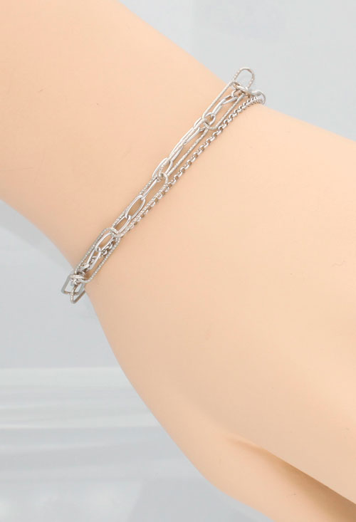 Pulsera plata formada por tres cadenas de diferentes tipos de eslabones una de asas alargadas otra de cadena fina de eslabones tipo rolo y la tercera una cadena de asas ovaladas, en uno de los extremos un cierre de seguridad tipo mosquetón y en el otro un tramo de cadena formada por asas redondas para poder abrochar el cierre en cualquiera de ellas a la medida que se precise.