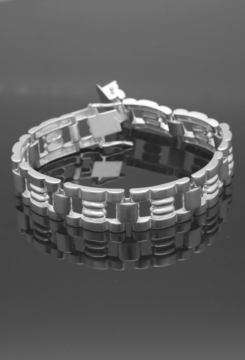 Pulsera plata para hombre eslabones en H, original modelo muy masculino formada por eslabones gallonados con forma de H, muy sólida y fuerte se cierra con sistema de lengüeta asegurada con dos cerrojillos de 8 uno a cada lado. Regalo ideal para dejar un recuerdo que le encantara llevar de forma habitual y pasara a formar parte de el mismo desde el primer instante.