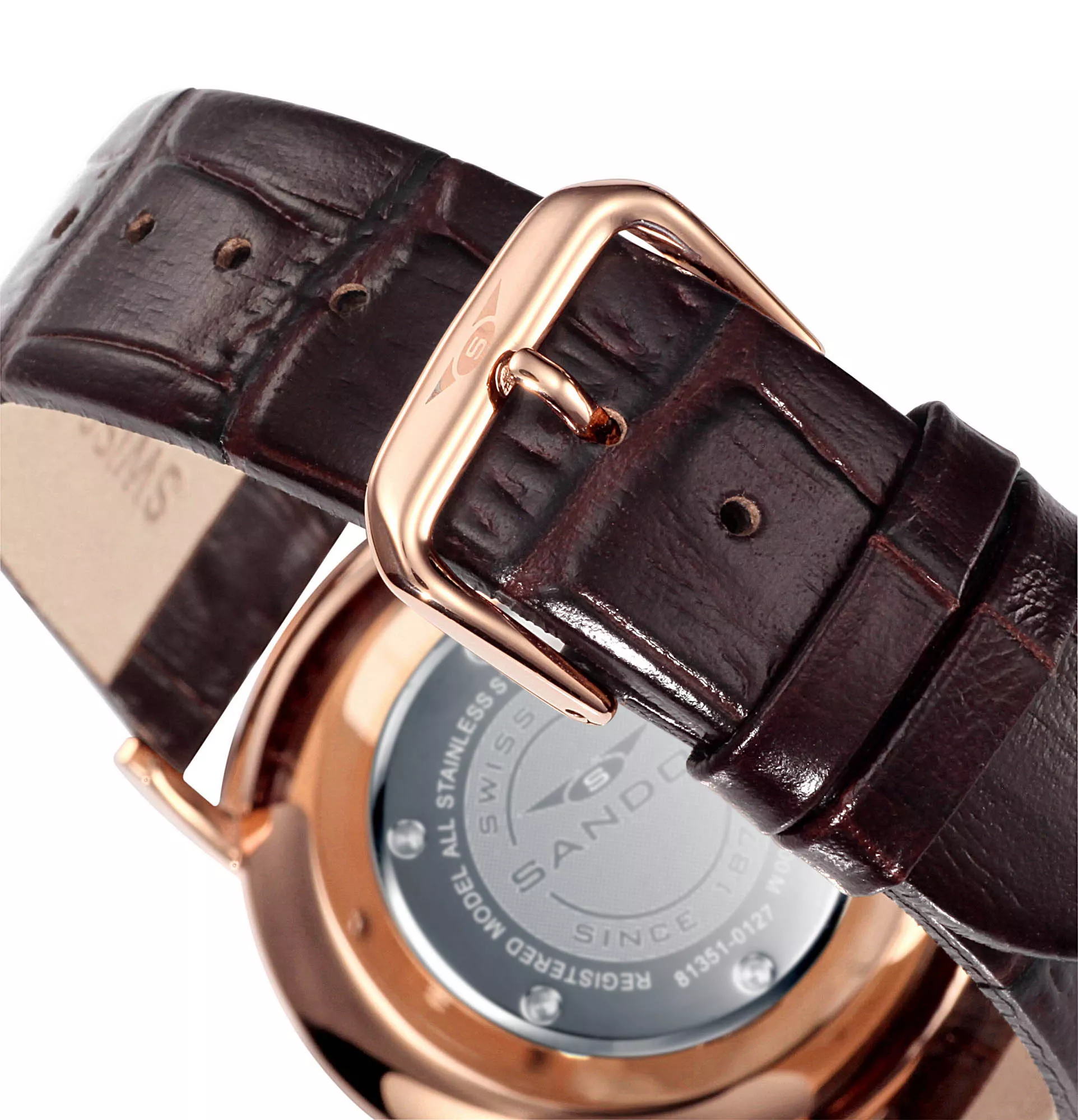 Reloj Sandoz Classic. Su diseño extraplano, combinado con detalles de lujo como la correa de piel marrón y el chapado en oro rosa, lo convierten en una verdadera obra de arte para tu muñeca.