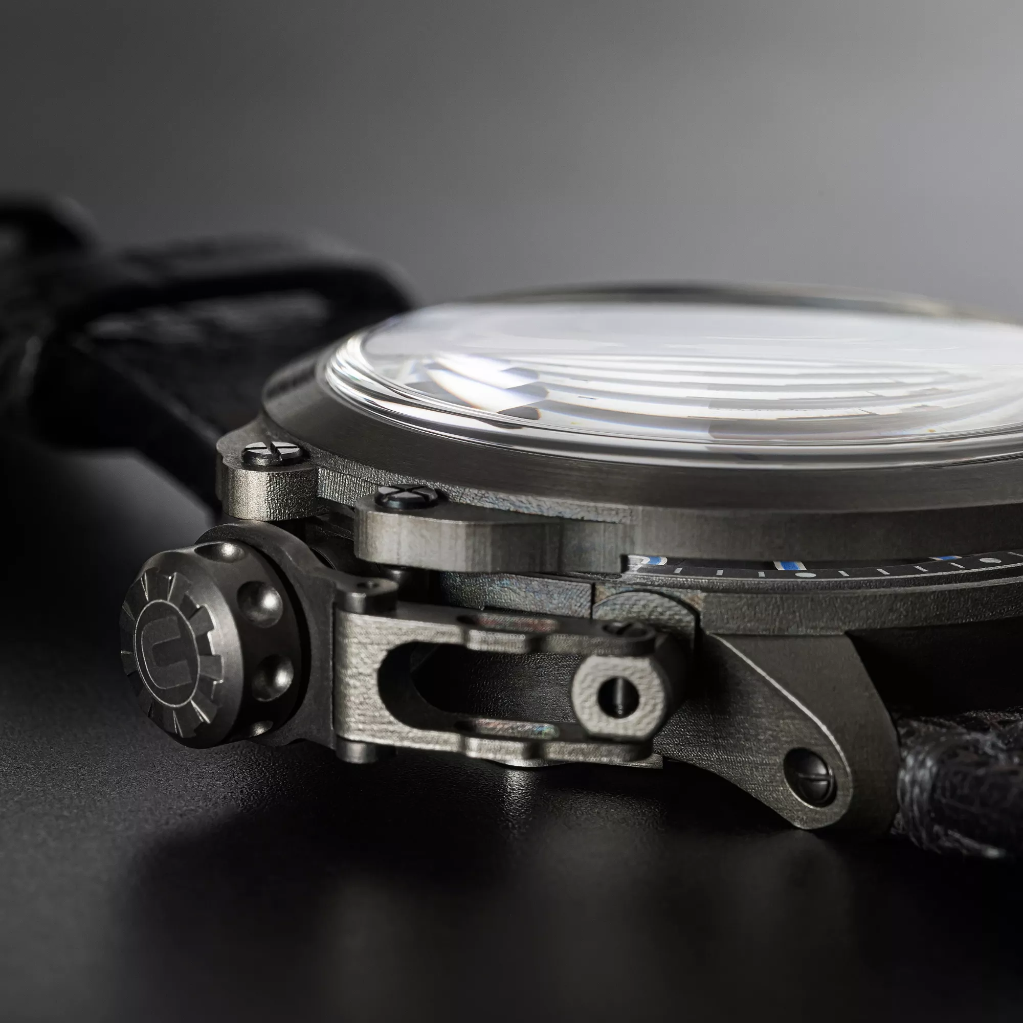 Este reloj presenta detalles que lo diferencian del resto, como su cristal de zafiro abovedado con tratamiento antirreflejos, su esfera negra de metal con superluminova beige para una visión clara en la oscuridad y su protección de corona patentada ubicada a la izquierda para una ergonomía óptima.