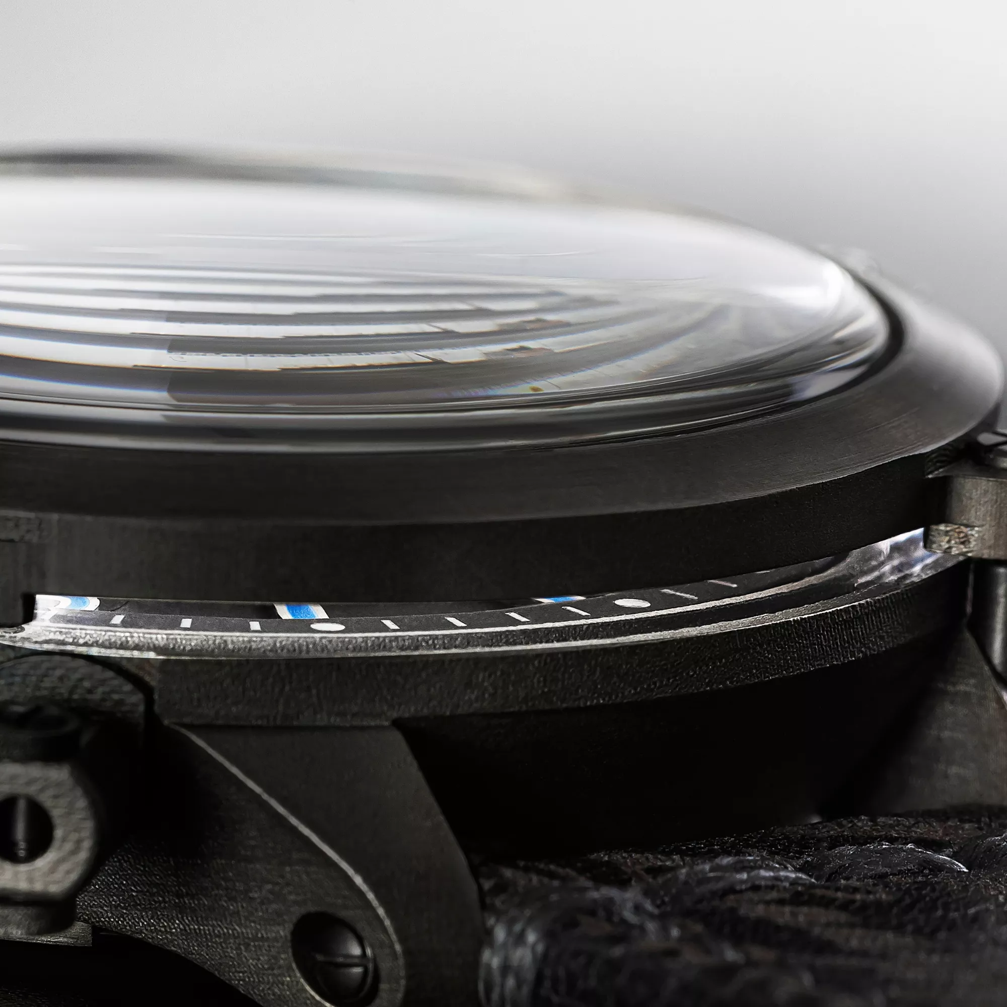 El diseño del Reloj U-Boat Capsule se inspira en las batisferas de la década de 1930, aquellos sumergibles esféricos que exploraban las profundidades marinas. Esta influencia se traduce en una estética steampunk que evoca los mundos submarinos de Julio Verne. La caja de acero inoxidable 316L tratada con PVD negro le otorga una apariencia robusta y sofisticada, mientras que el cristal de zafiro abovedado con tratamiento antirreflejos mejora la legibilidad y añade un toque de elegancia.