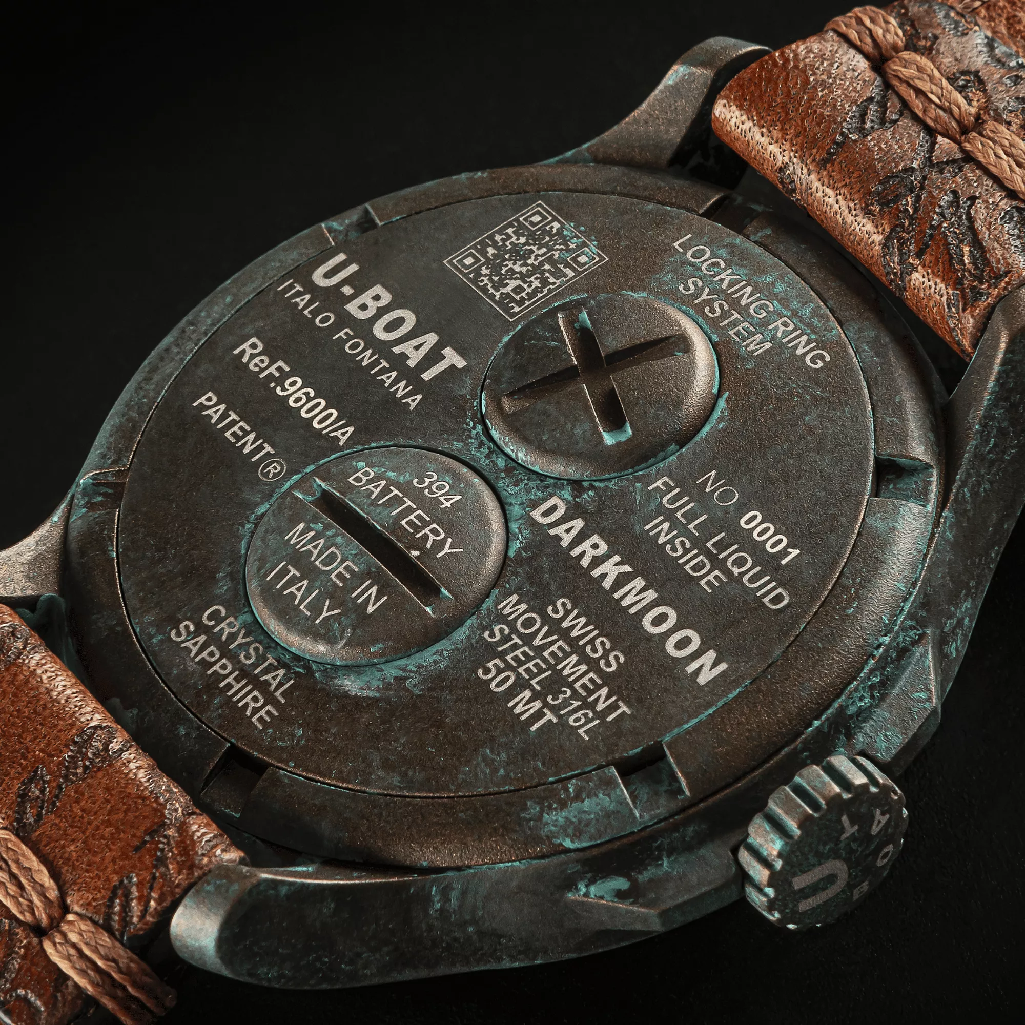 El tratamiento de bronce envejecido de la caja del Reloj U-Boat DarkMoon es un detalle que lo hace destacar entre otros relojes de lujo. Este acabado no solo aporta un aire vintage y sofisticado, sino que también garantiza que cada pieza sea única. Además, el sistema de cierre inferior innovador, conocido como Locking Ring System, permite un ajuste preciso y seguro, ideal para el uso diario.
