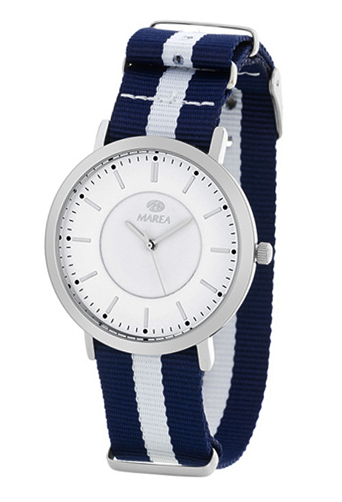 Reloj Marea Trendy unisex caja de acero y correa de tela, precioso reloj con maquinaría analógica y movimineto de cuarzo con correa en tela azul y blanca, caja de 40 mm. de diámetro y 8 mm. de grosor, correa de 20 mm. de ancho, resistencia al agua de 30 Mts ó 3 Atm. esfera de color blanca y plata, agujas e indices plateados.