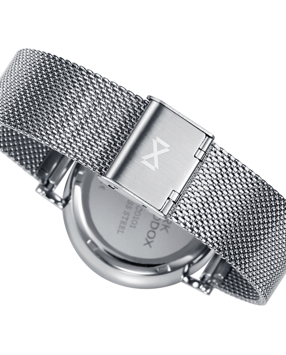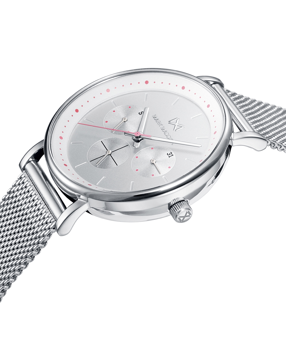 Reloj Mark Maddox Notting en acero para mujer, esfera plateada con 3 sub-esferas que indican el día del mes, el de la semana, la caja es de acero inoxidable y antialégica, la correa es de acero tipo malla milanesa, este reloj tiene una resistencia al agua de 50 metros ó 5 atmósferas, la caja mide 38 milímetros de diámetro y el cierre es de tipo desplegable, cristal mineral de alta resistencia.