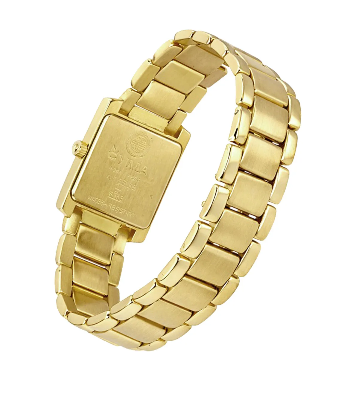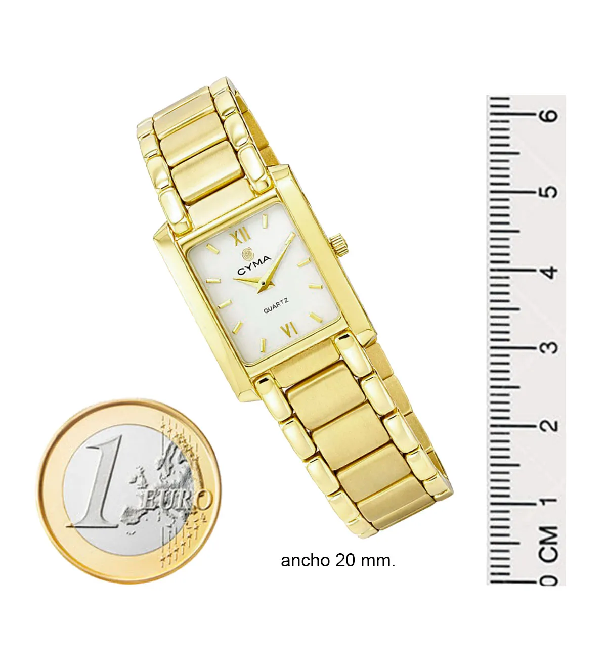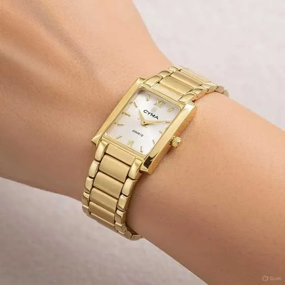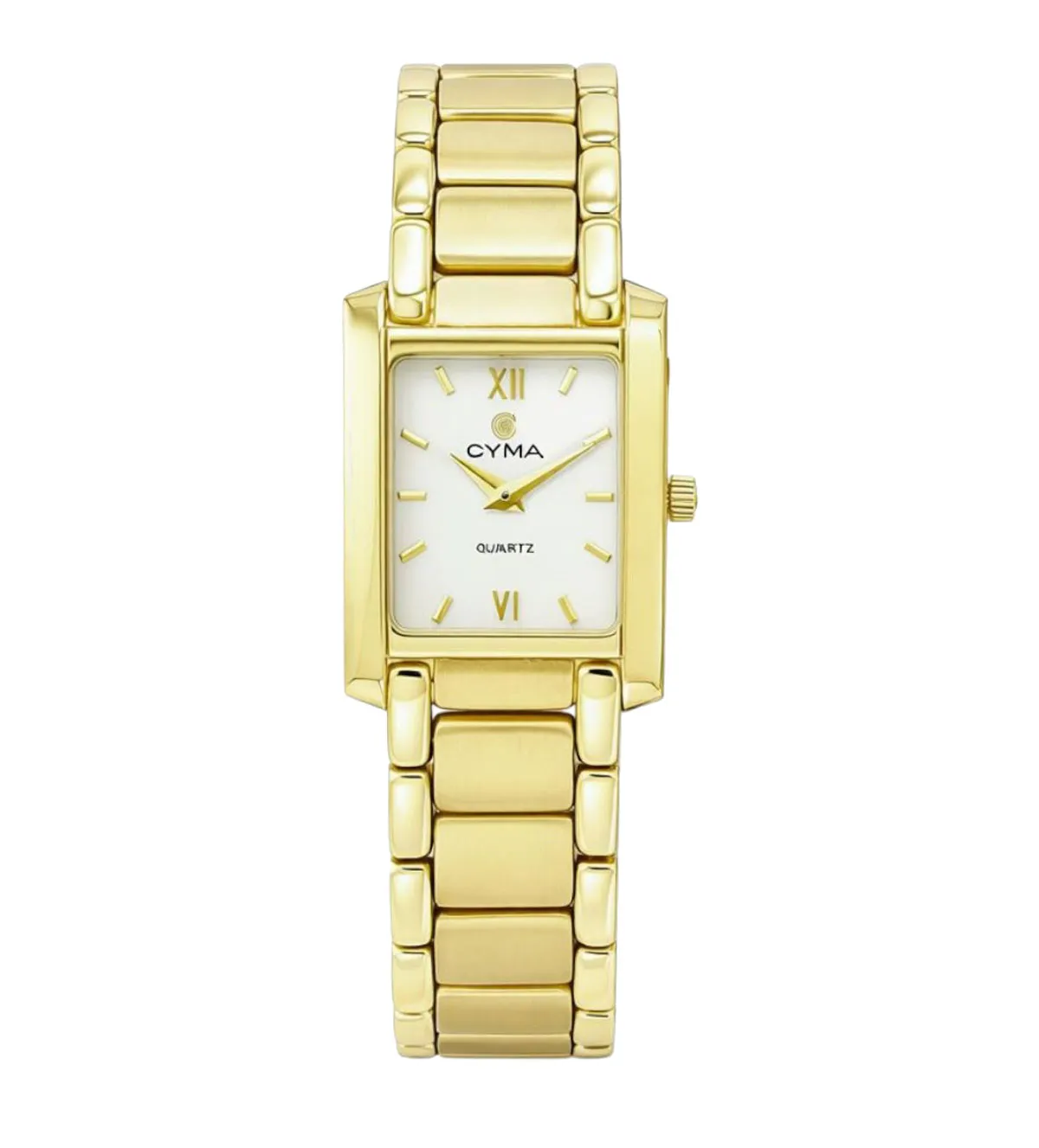 El reloj de oro para mujer marca Cyma combina elegancia y tecnología en un diseño único. Fabricado en oro amarillo de 18 kilates, cuenta con una caja rectangular de biseles brillantes, esfera blanca con índices y números romanos, y un brazalete de eslabones con acabado mate y brillo. Su mecanismo suizo de cuarzo garantiza precisión, mientras el cierre oculto aporta seguridad.