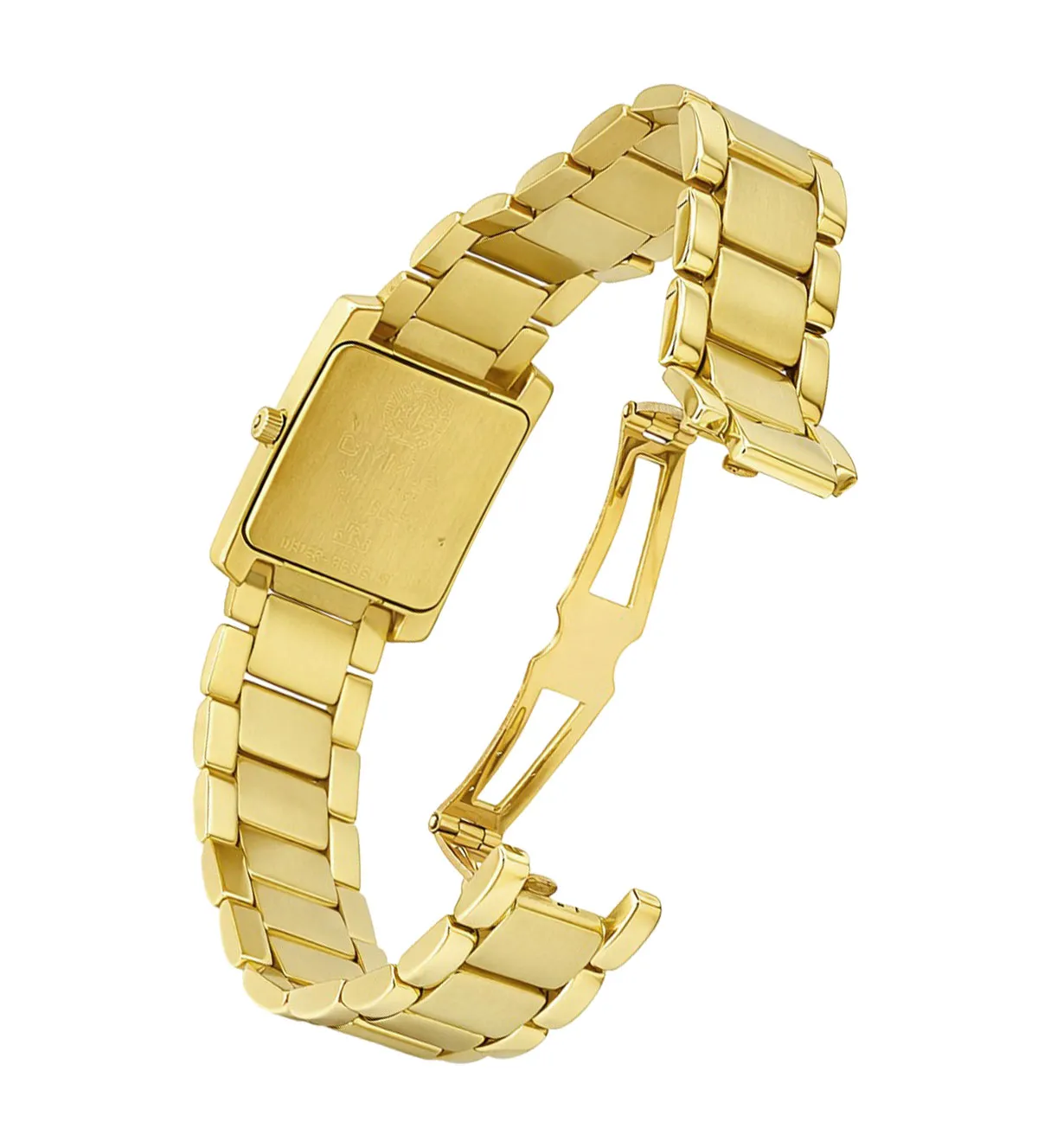 El reloj está fabricado en oro amarillo de 18 kilates, lo que le otorga un brillo cálido y duradero. Su brazalete de eslabones combina acabados mate y brillantes, creando un contraste visual que resalta su diseño. La caja rectangular, con medidas de 20.7 x 20 mm, presenta biseles planos de acabado brillante, añadiendo un toque de sofisticación. La esfera blanca con índices y números romanos está protegida por un cristal resistente que garantiza su durabilidad a lo largo del tiempo.