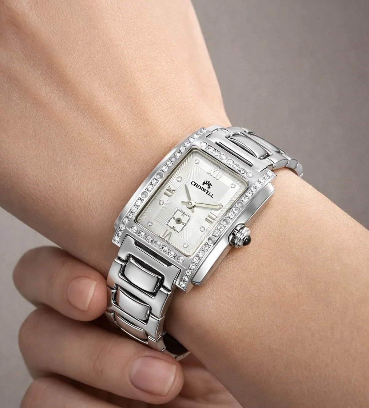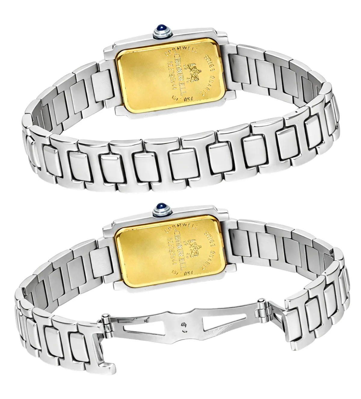 Este reloj tiene un peso total de 60 gramos, un equilibrio perfecto entre robustez y ligereza, lo que lo hace cómodo para llevar durante todo el día. El brazalete mide 14 milímetros de ancho y se adapta perfectamente a la muñeca. El largo del reloj es de aproximadamente 21 centímetros, lo que lo hace adecuado para la mayoría de las mujeres. La caja rectangular tiene unas dimensiones de 33 x 23 mm, proporcionándole una presencia notable sin resultar excesivamente grande.