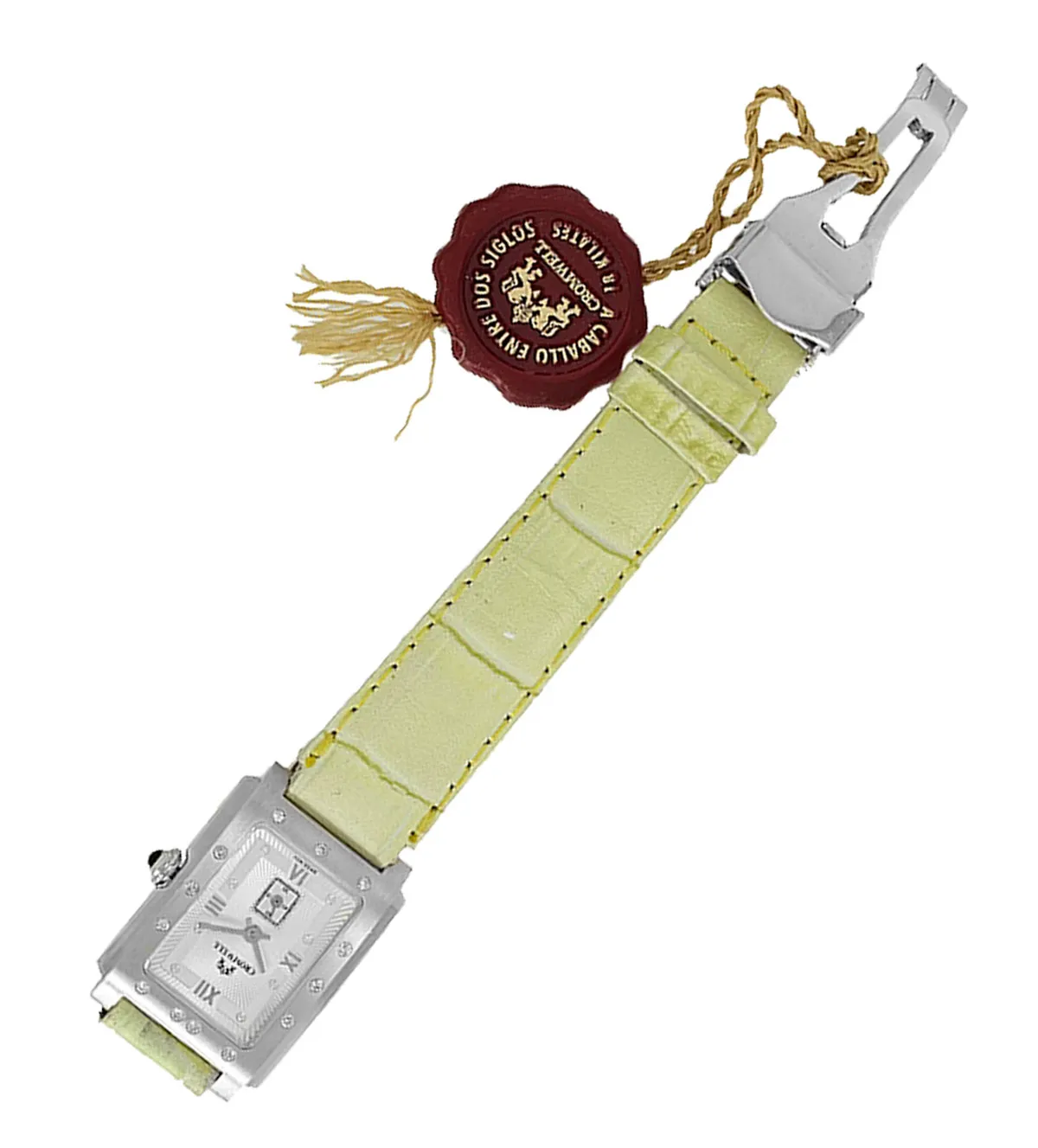 El reloj presenta una caja de 34 x 23 milímetros, una medida ideal para muñecas femeninas que buscan presencia sin excesos. Su peso aproximado de 23 gramos, sin incluir la correa, garantiza una sensación cómoda y ligera. La correa de piel en tono verde claro, con un ancho de 12 milímetros, aporta un contraste elegante y actual, adaptándose con suavidad a la muñeca.