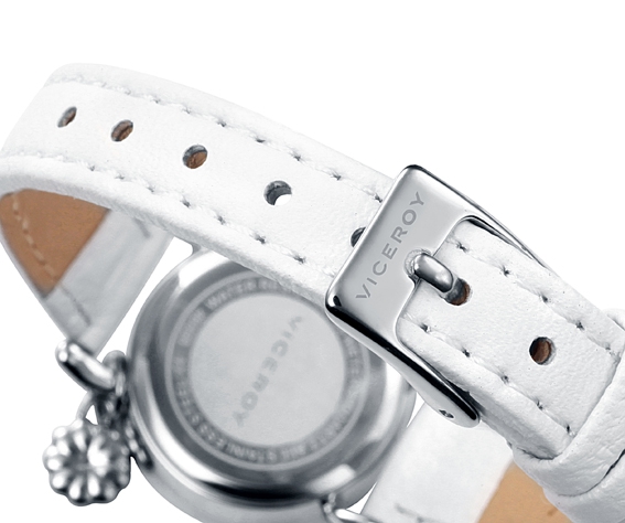 Reloj Viceroy acero y cuero niña, máquina de cuarzo analógica, correa de piel blanca, caja redonda de 24 milímetros en acero con esfera blanca y números árabes en rosa agujas de hora y minútos en color plata, segundero en rosa, corona con detalle rosa, este reloj tiene una resistencia al agua de 30 metros o 3 atmósferas, el cristal es mineral de alta resistencia, bisel esmaltado en blanco.