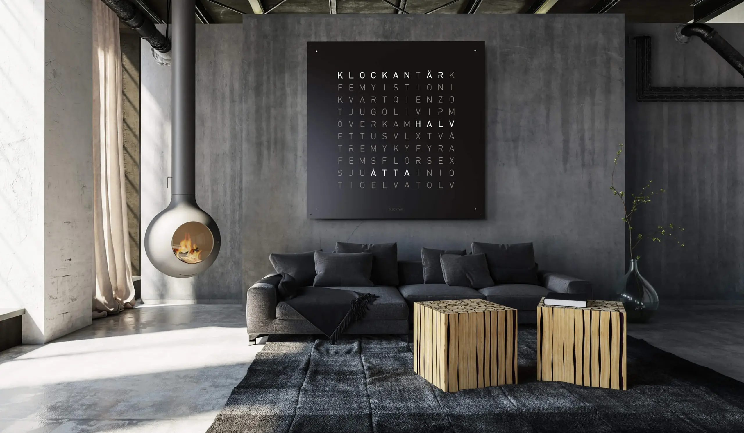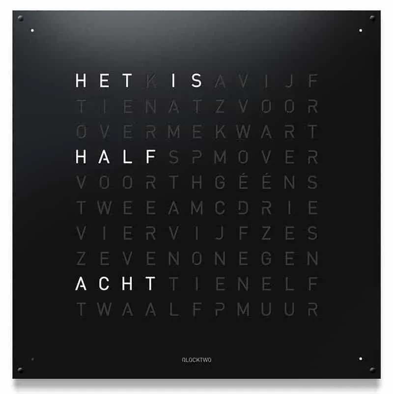 El diseño del Qlocktwo Earth 180 Black Pepper es una declaración de vanguardia. En lugar de las clásicas manecillas o números digitales, este reloj muestra la hora en palabras, como si el tiempo te hablara directamente. Su panel frontal presenta frases breves como “son las dos y media” o “es la una y cinco”, en un juego visual que convierte la lectura del tiempo en una experiencia poética. Este panel está disponible en varios idiomas, y su intensidad luminosa se ajusta automáticamente según la luz ambiental, ofreciendo siempre una visibilidad perfecta sin molestar la vista.
