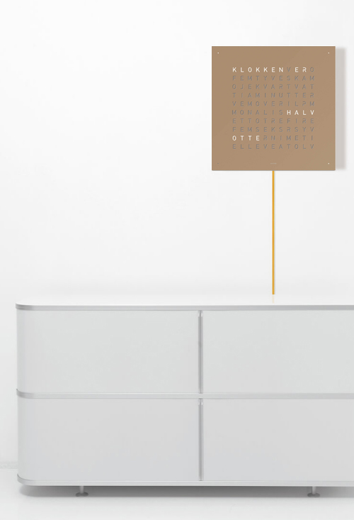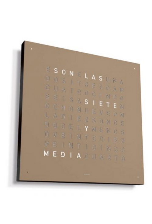 Qlocktwo Stainless Steel Hazelnut reloj de pared en el caso de este reloj de pared muestra un frontal de color avellana en acero inoxidable con terminación de polvo mate, ensamblado y tratado uno a uno de forma manual por los artesanos de Qlocktwo.